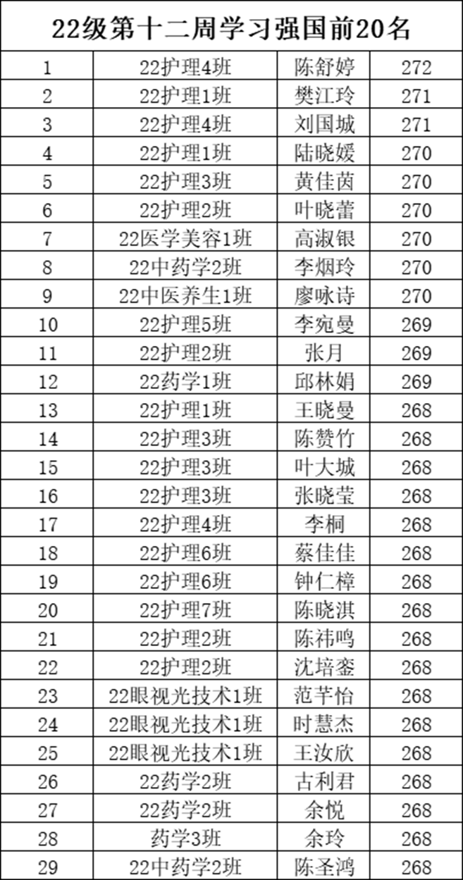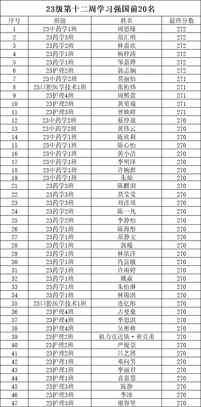 为推动学习贯彻习近平新时代中国特色社会主义思想主题教育走深走实。加强大学生党的教育,充分利用好“学习强国”优质网络学习平台,在支部内形成“比、学、赶、超”的良好学习氛围,现将我院各级学生第十二周的学习强国前二十名学生的积分作如下公示: