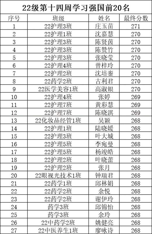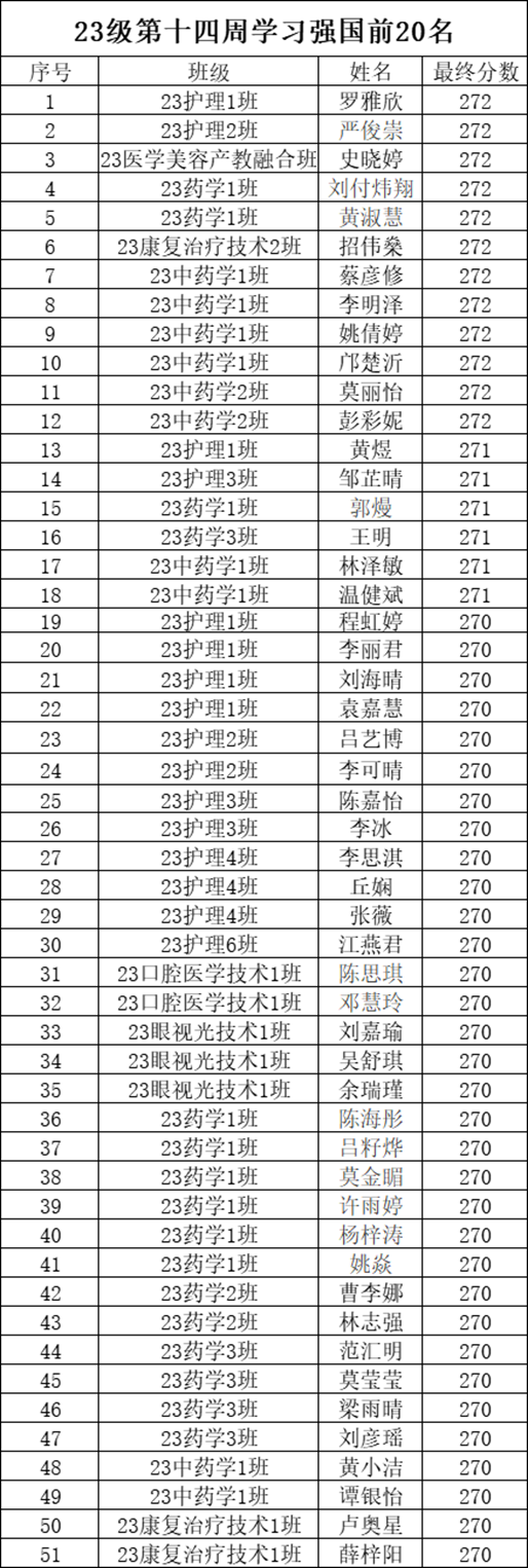 为推动学习贯彻习近平新时代中国特色社会主义思想主题教育走深走实。并让同学们增强党的教育,充分利用好“学习强国”优质网络学习平台,在支部内形成“比、学、赶、超”的良好学习氛围,现将我院各级学生第十四周的学习强国前二十名学生的积分做如下公示。