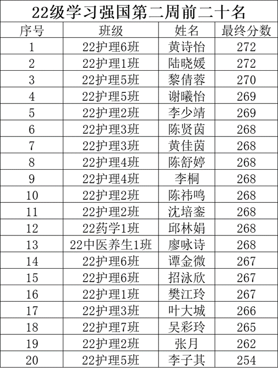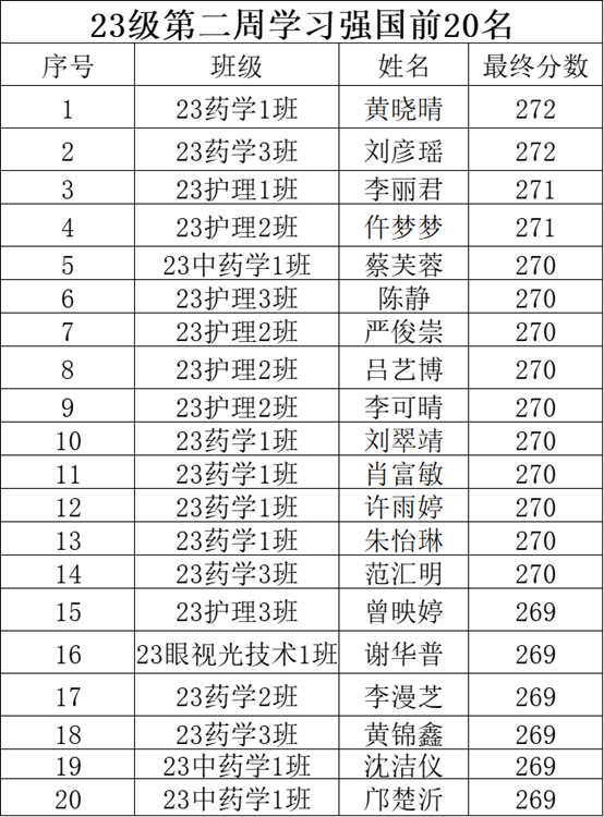 育走深走实。并让同学们增强党的教育,充分利用好“学习强国”优质网络学习平台,在支部内形成“比、学、赶、超”的良好学习氛围,现将我院各级学生第二周的学习强国前二十名学生的积分作如下公示: