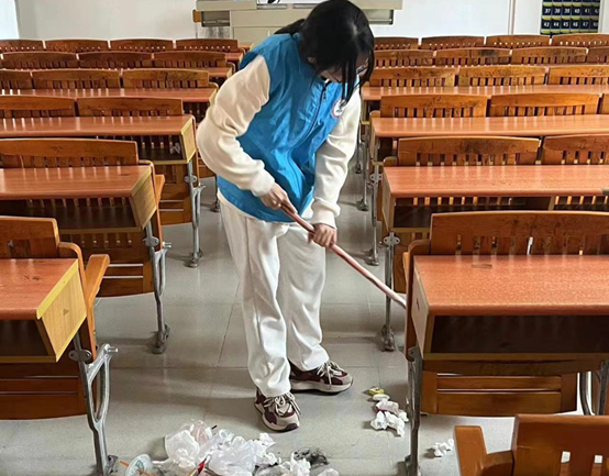 图为志愿者清扫教学楼