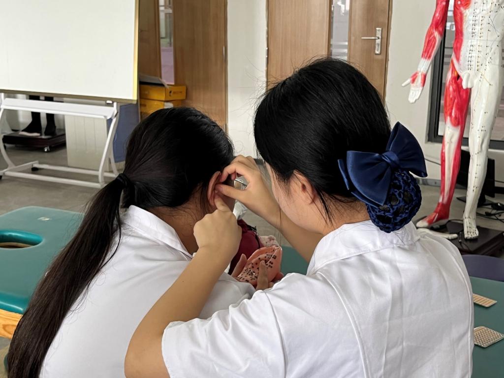 接着,许梓淳同学给学员们示范如何找到正确的穴位,让学员们进一步掌握了常用耳穴的分布规律、定位和主治、耳穴压丸的方法,熟悉了耳穴压丸的注意事项。掌握耳与经络的关系有助于根据其原理治病。