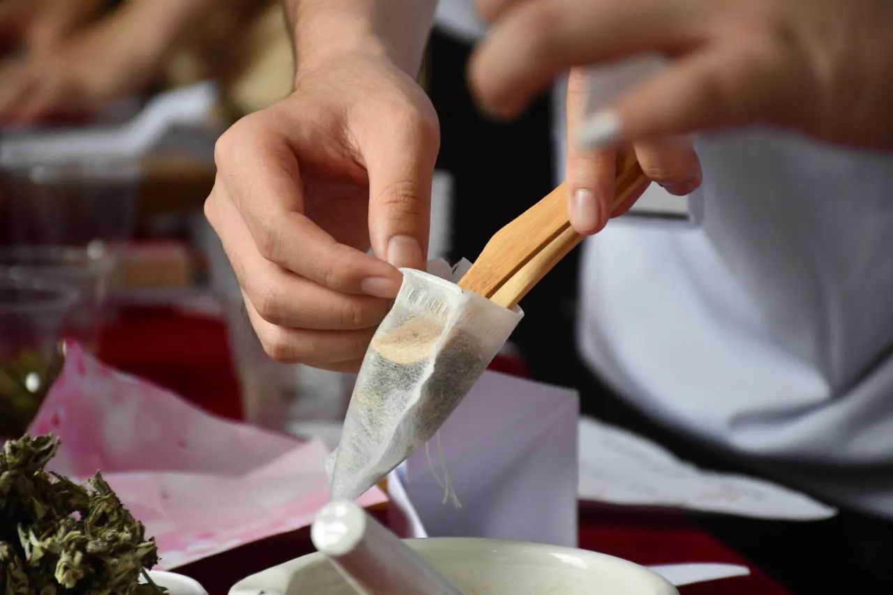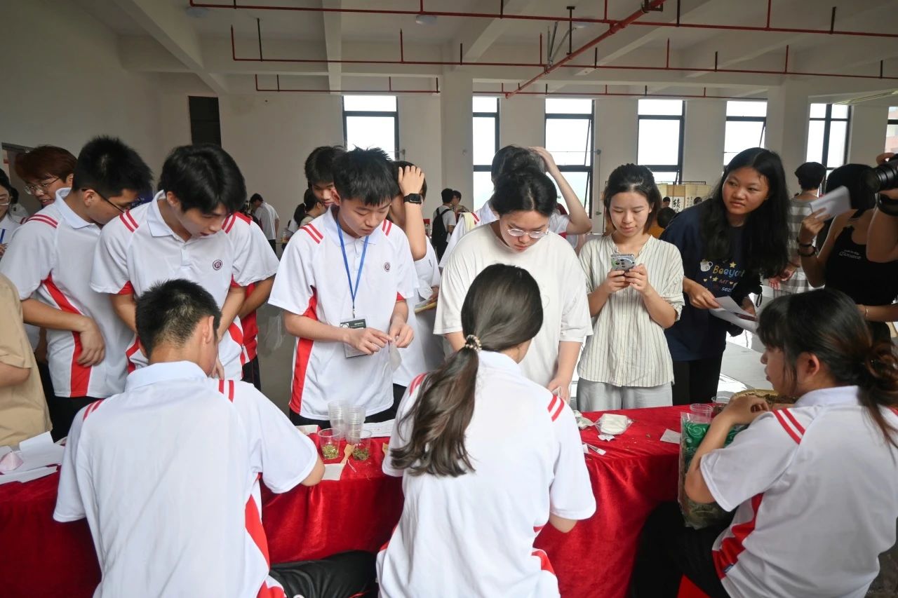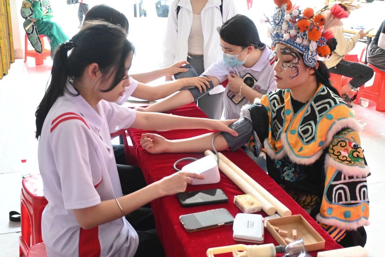 在健康医学院的摊位前,师生们络绎不绝,纷纷驻足体验养生香包、花茶、拔罐、推拿按摩、血压测量等传统中医保健项目。
