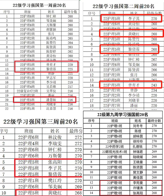 班级同学不但在每周学习强国积分榜基本每次都有上榜,而且学习强国榜单上的同学在全年级的排名都位列前20名。