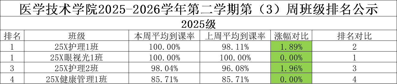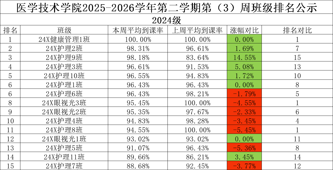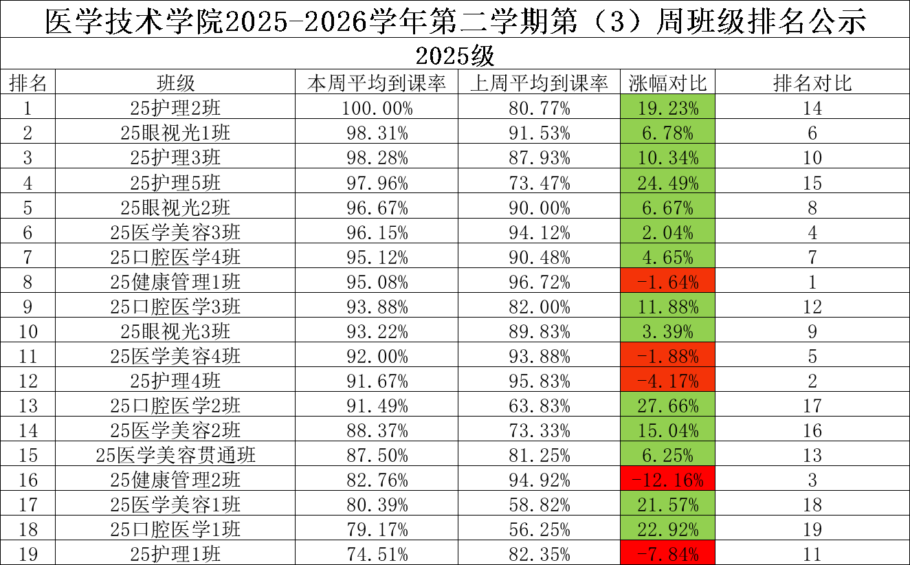 为持续筑牢我院学风建设坚实根基,切实强化学生规则意识与学业投入度,厚植勤学善思、自主向学的优良氛围,医学技术学院学生会于2025-2026学年第二学期第3周,开展课堂纪律专项检查工作。现将本周到课率情况予以公示。