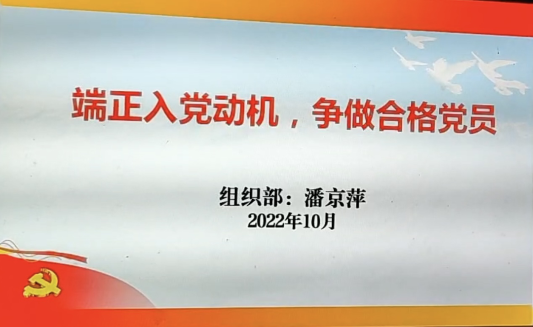 2022年10月21日晚上,健康医学院党总支 2022 年秋季学期初级党课线上培训第三讲在钉钉平台顺利举行,我校党委组织部部长潘京萍老师以“端正入党动机,争做合格党员”为主题给学员进行了讲授。