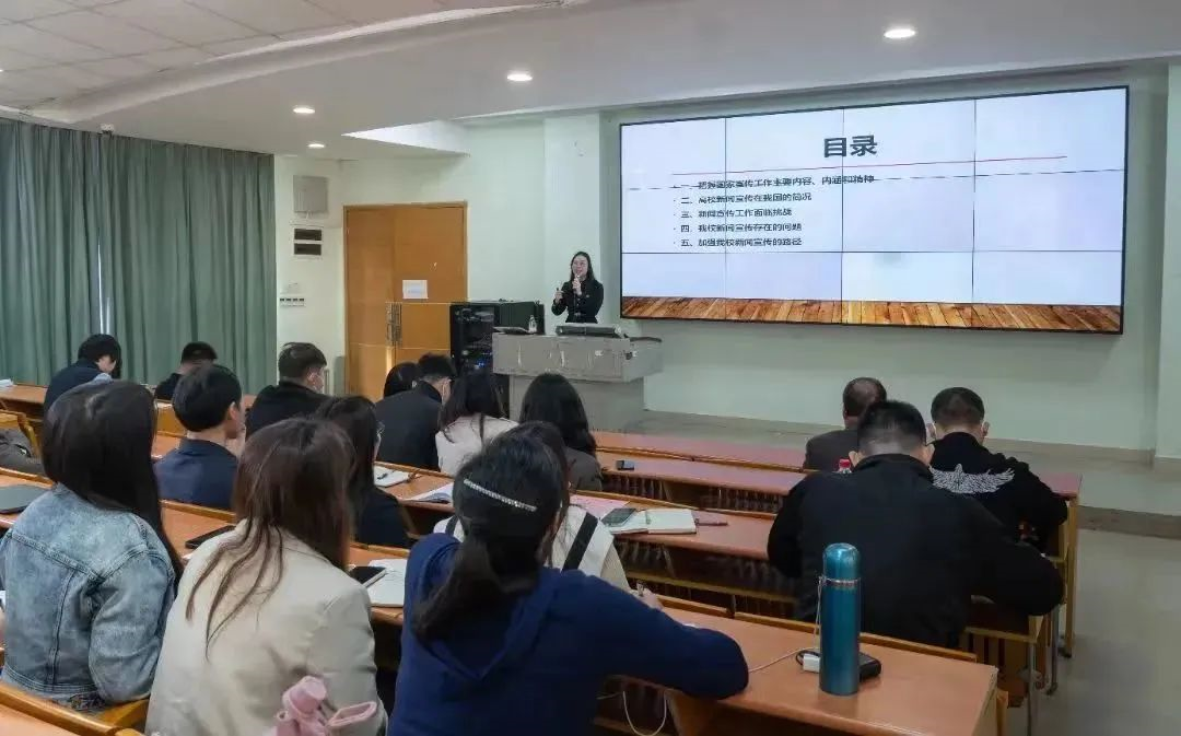 宣传部部长姚嘉敏从把握国家宣传工作主要内容、内涵和精神,高校新闻宣传在我国的简况以及新闻宣传工作面临的挑战等阐述了宣传工作的重要性,指出了我校宣传工作存在的问题,提出了加强我校新闻宣传的路径。