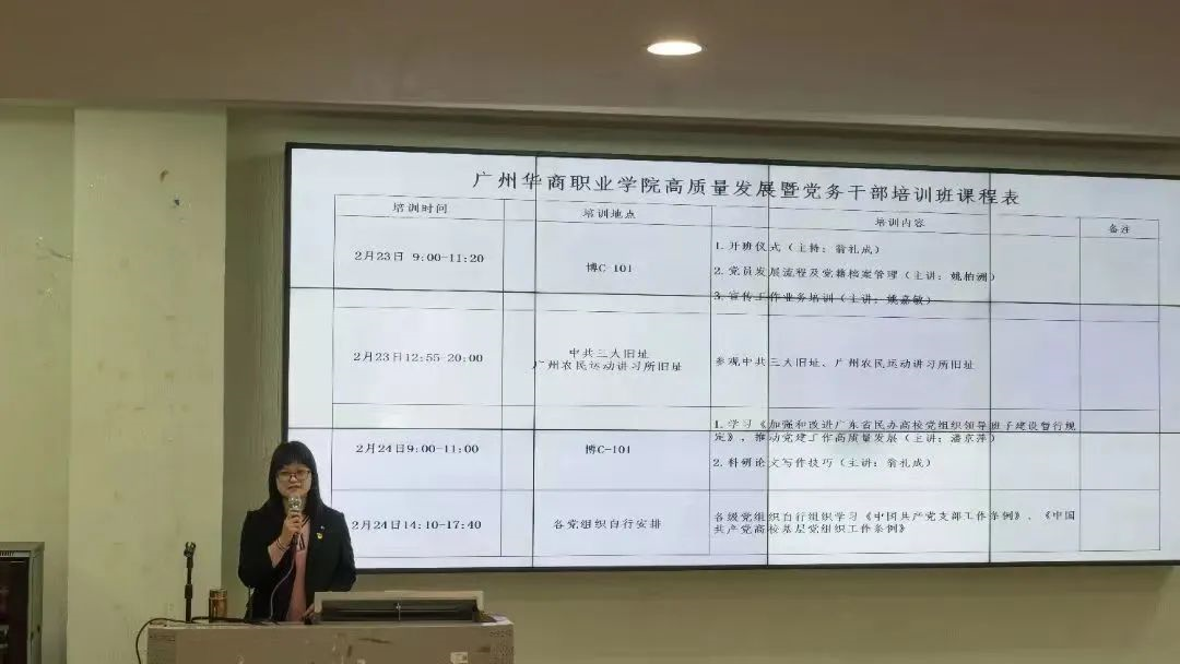 刘潇老师代表全体培训班全体学员发言,党委组织部部长潘京萍介绍培训课程安排。