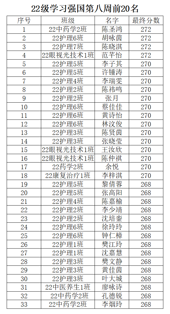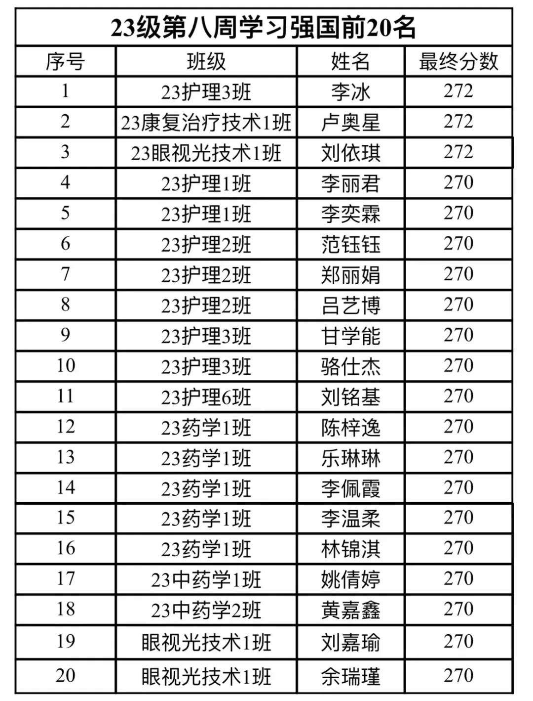 为推动学习贯彻习近平新时代中国特色社会主义思想主题教育走深走实。并让同学们增强党的教育,充分利用好“学习强国”优质网络学习平台,在支部内形成“比、学、赶、超”的良好学习氛围,现奖我院各级学生第八周的学习强国前二十名学生的积分作如下公示: