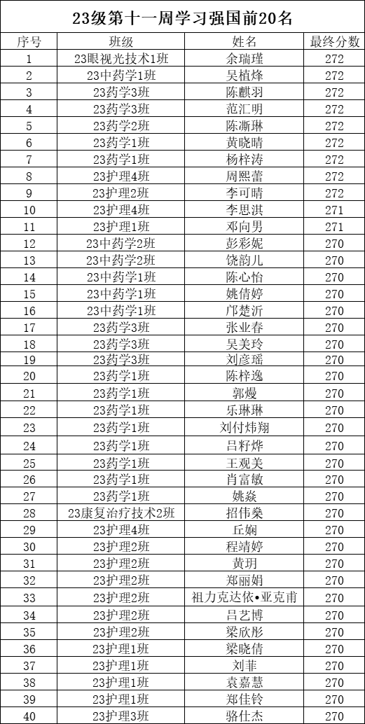 为推动学习贯彻习近平新时代中国特色社会主义思想主题教育走深走实。加强大学生党的教育,充分利用好“学习强国”优质网络学习平台,在支部内形成“比、学、赶、超”的良好学习氛围,现将我院各级学生第十一周的学习强国前二十名学生的积分作如下公示: