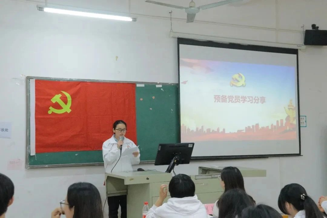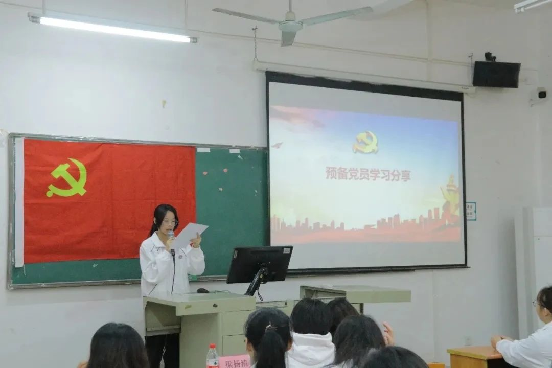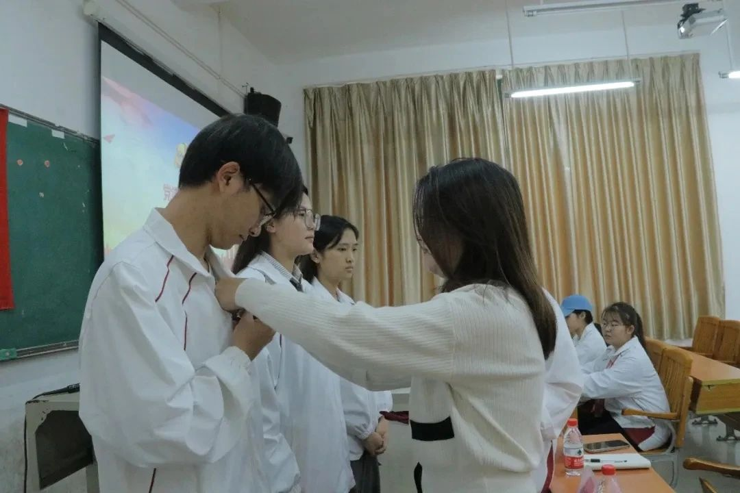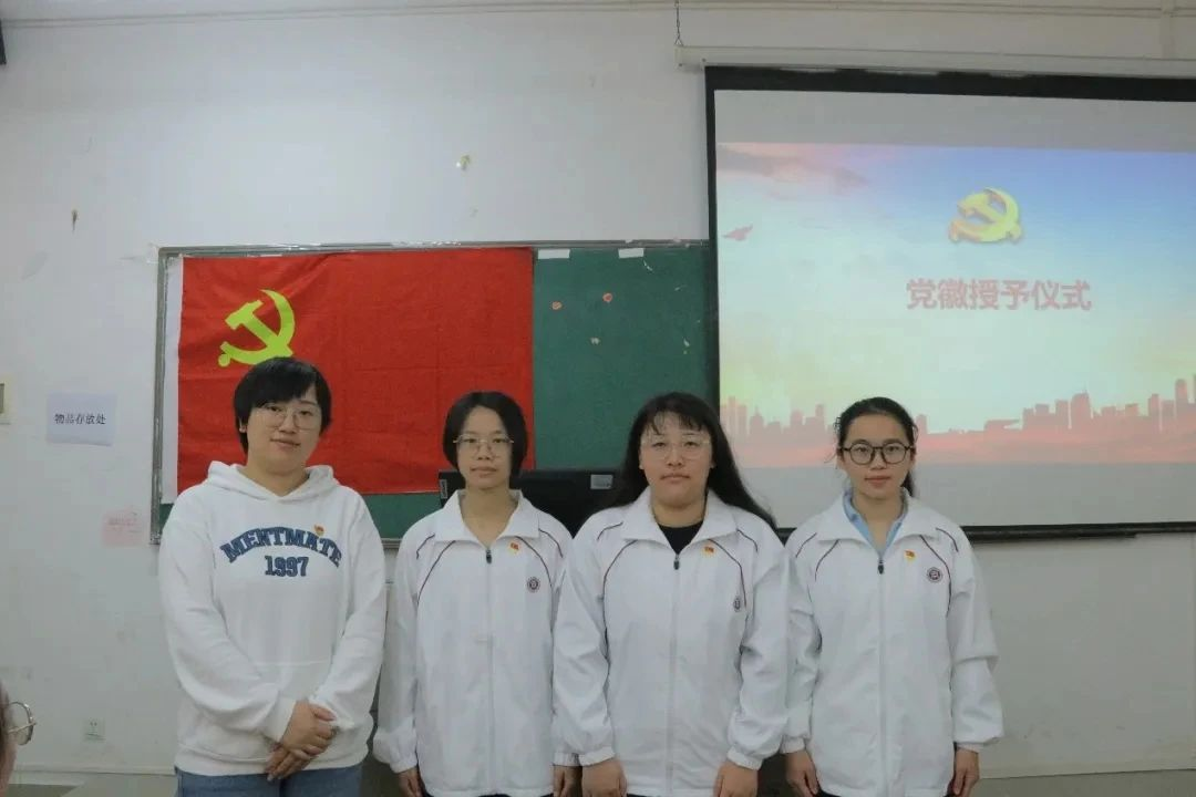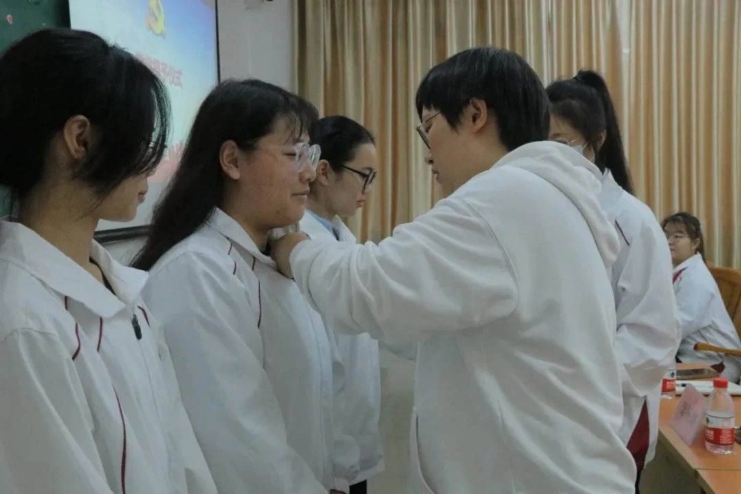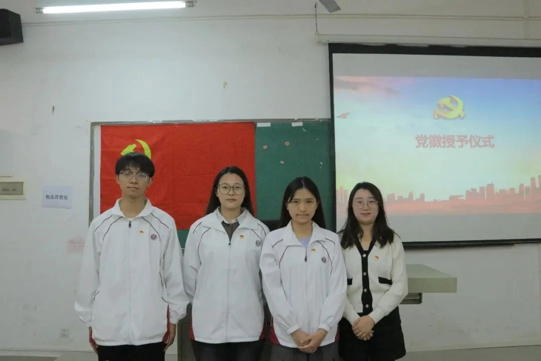 授予预备党员党徽仪式。学生第一党支部宣传委员梁杨清老师上台为周慧靖、古利君、王怡敏三位同志授予党徽。