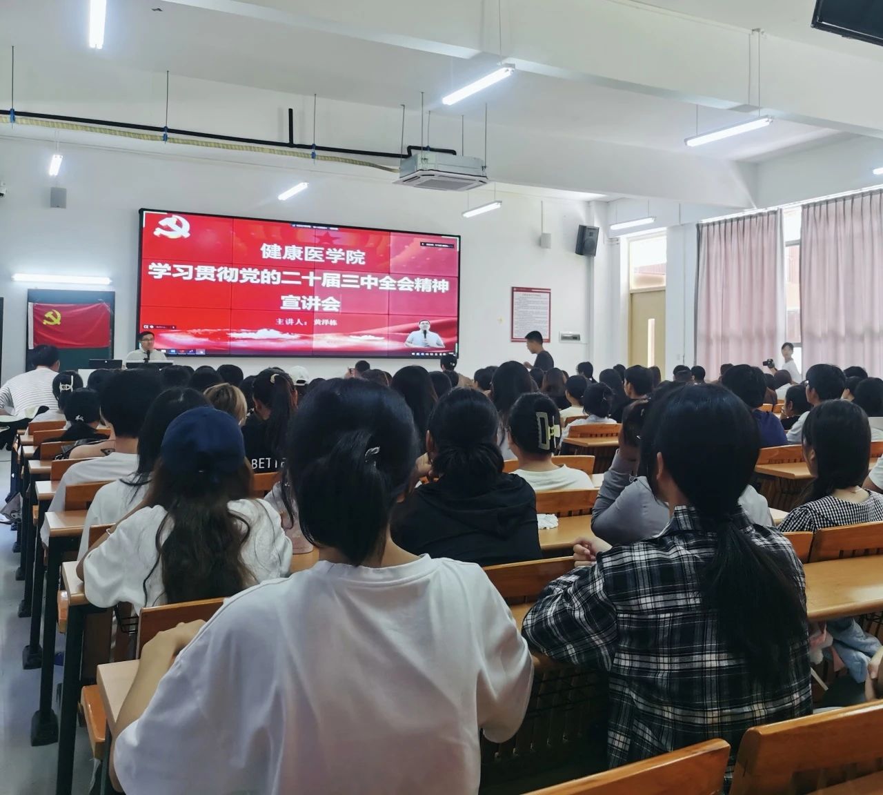 2024年9月27日中午,健康医学院开展学习贯彻党的二十届三中全会精神宣讲会,江门校区在教学大楼2号楼104召开,广州校区线上参会。广州和江门双校区师生代表参加宣讲会,宣讲会由健康医学院党总支副书记黄泽栋副教授主讲。