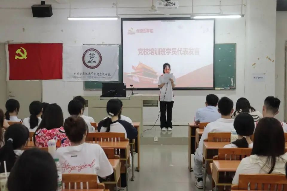 本期培训班学员代表24护理4班袁雅琪同学发言。她提到,作为新时代青年应当坚定理想信念,坚定不移跟党走,要以积极的态度和行动,为社会的进步和发展做出自己的贡献。