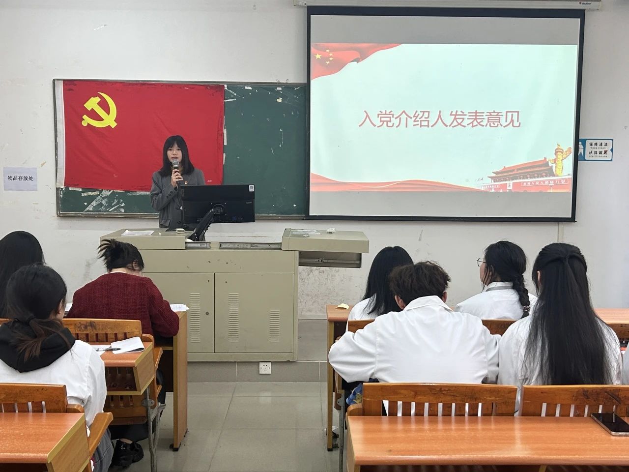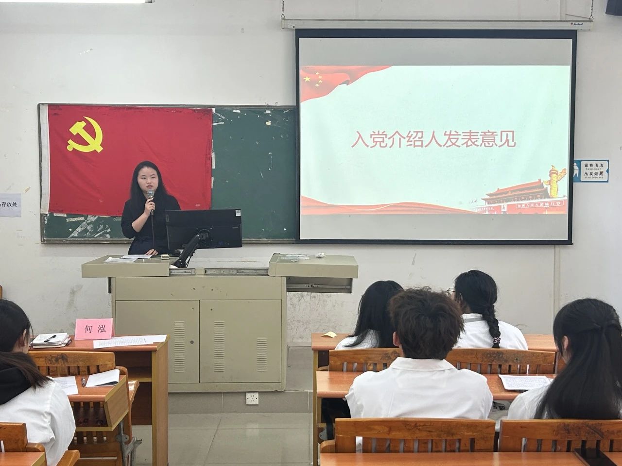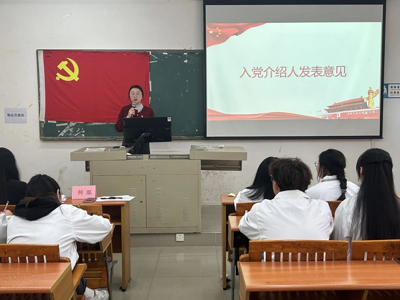 李金瑛等6名发展对象依次上台汇报自己一年以来的思想、学习、生活和工作等情况。各入党介绍人介绍培养过程并对其能否被接收为中共预备党员发表意见。