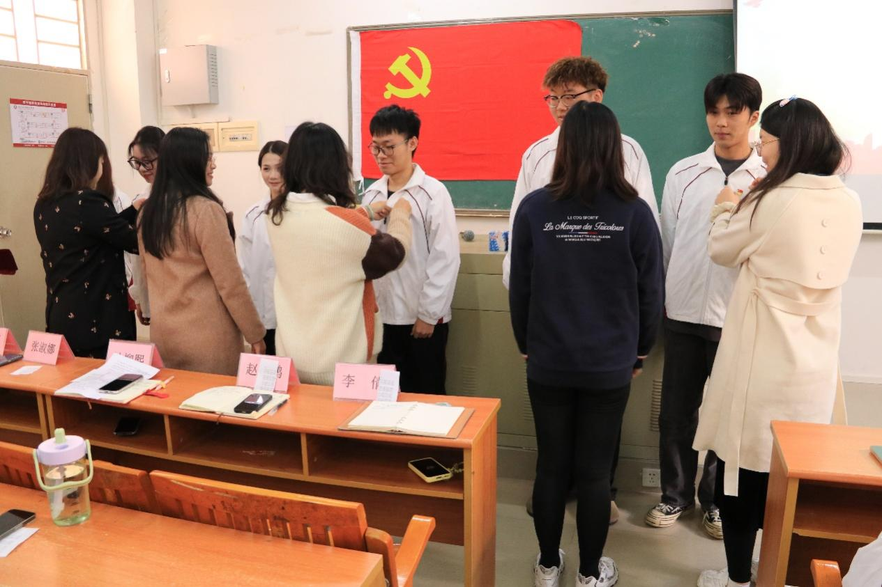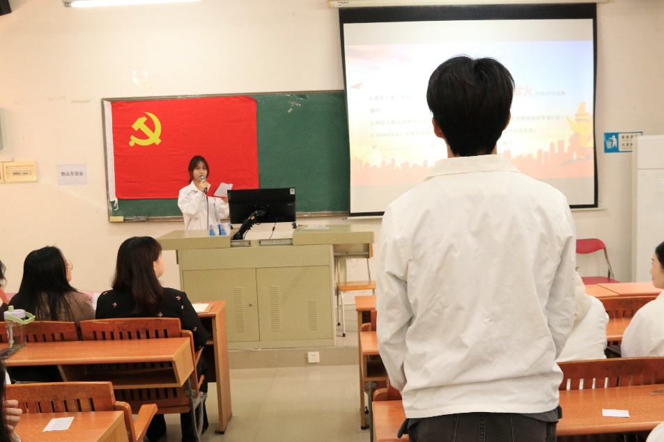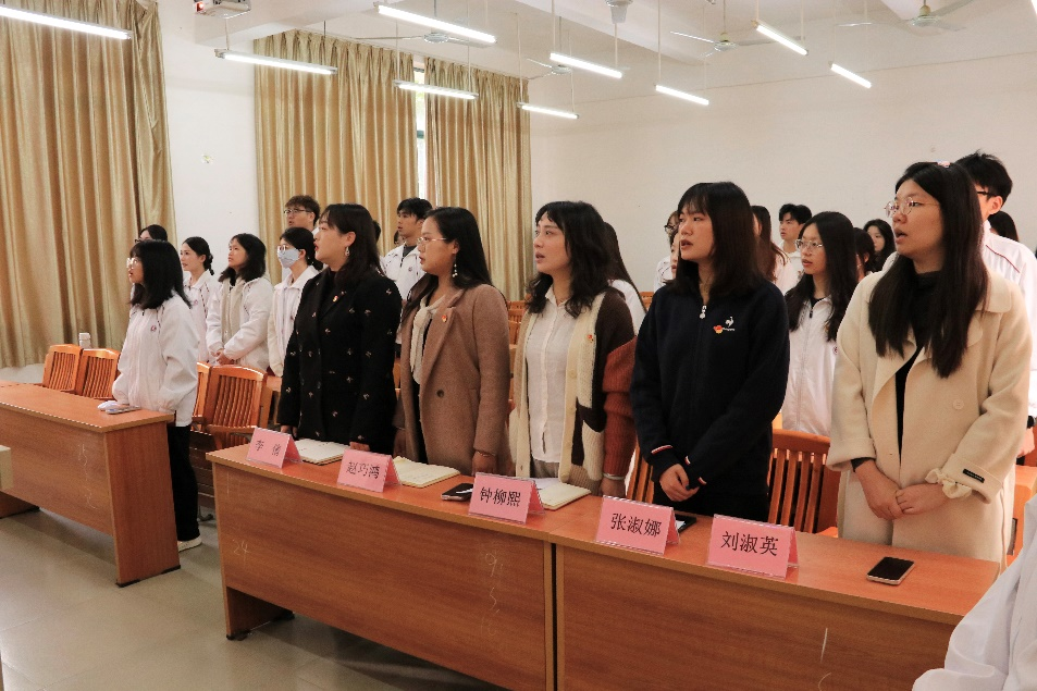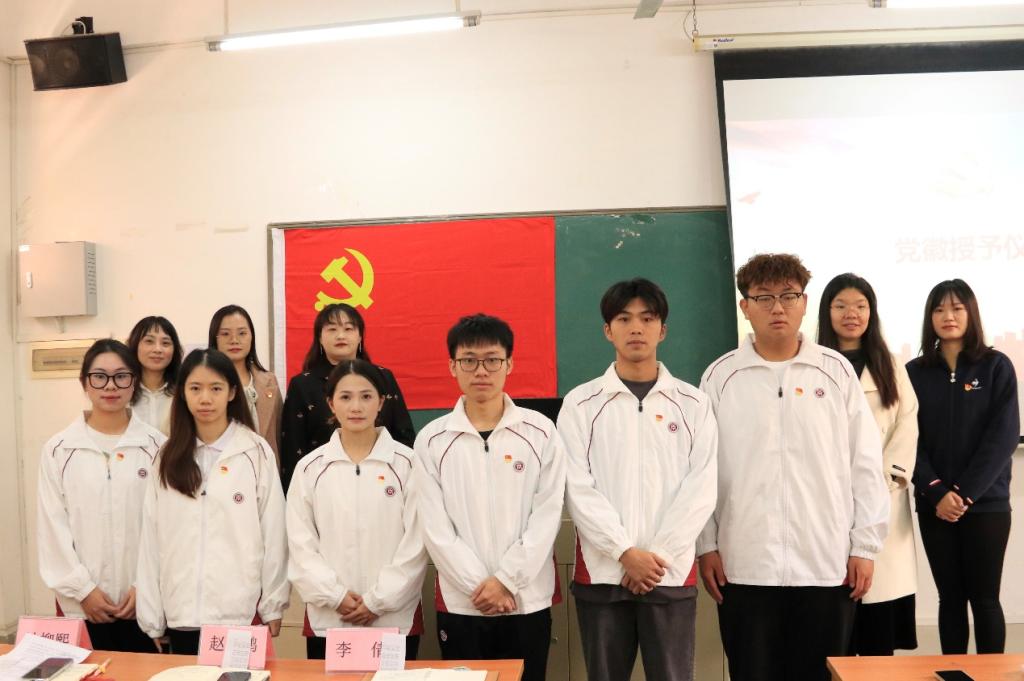 健康医学院学生第二党支部的全体教师党员为李梓淇等8名预备党员授党徽。