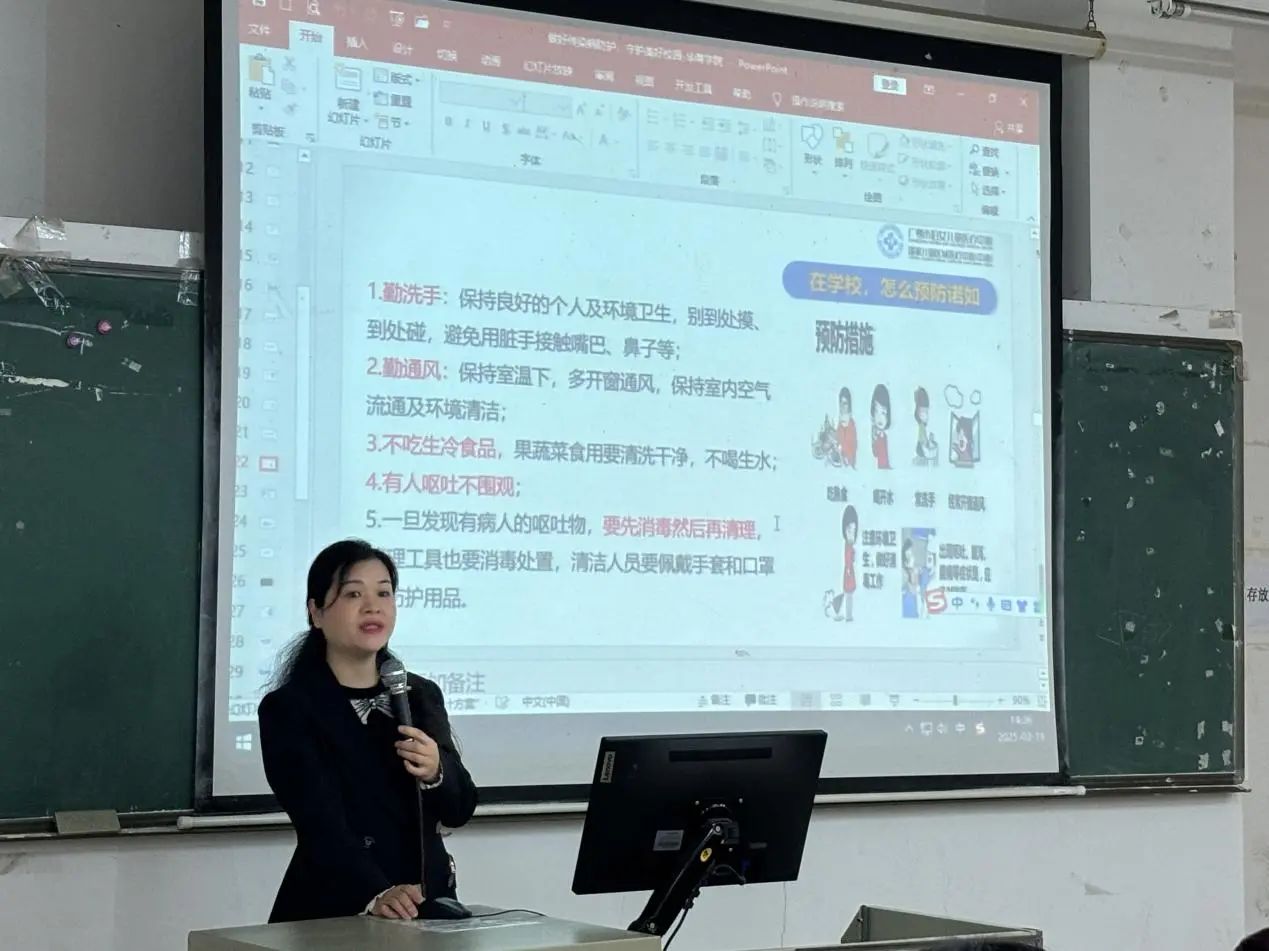 讲座中,朱立琼老师深入浅出地介绍传染病的基本概念,包括传染病的定义、分类等,让师生对传染病有一个清晰的认识。同时,她还详细剖析常见传染病的传播途径,如空气传播、接触传播等,让大家对传染病的传播方式和预防方法有一定的理解。