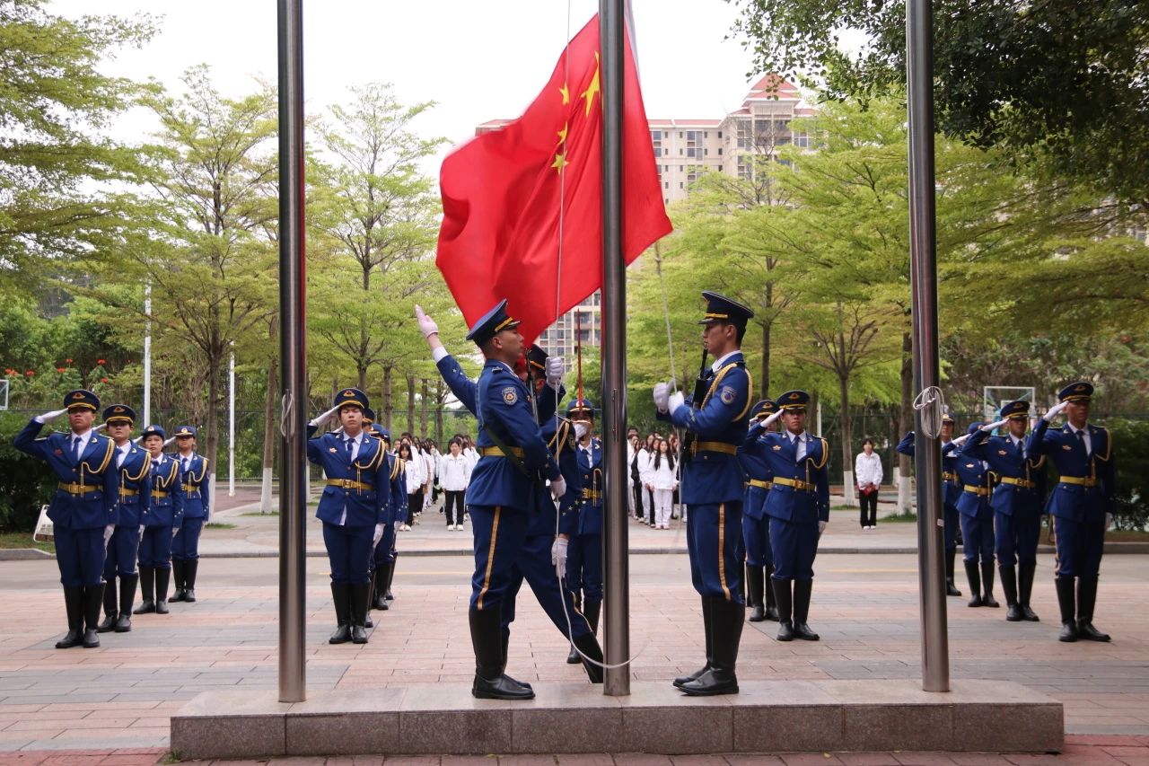 全体肃立,升国旗,奏唱国歌。五星红旗随着国歌声缓慢上升,它承载着希望,也承载着责任。