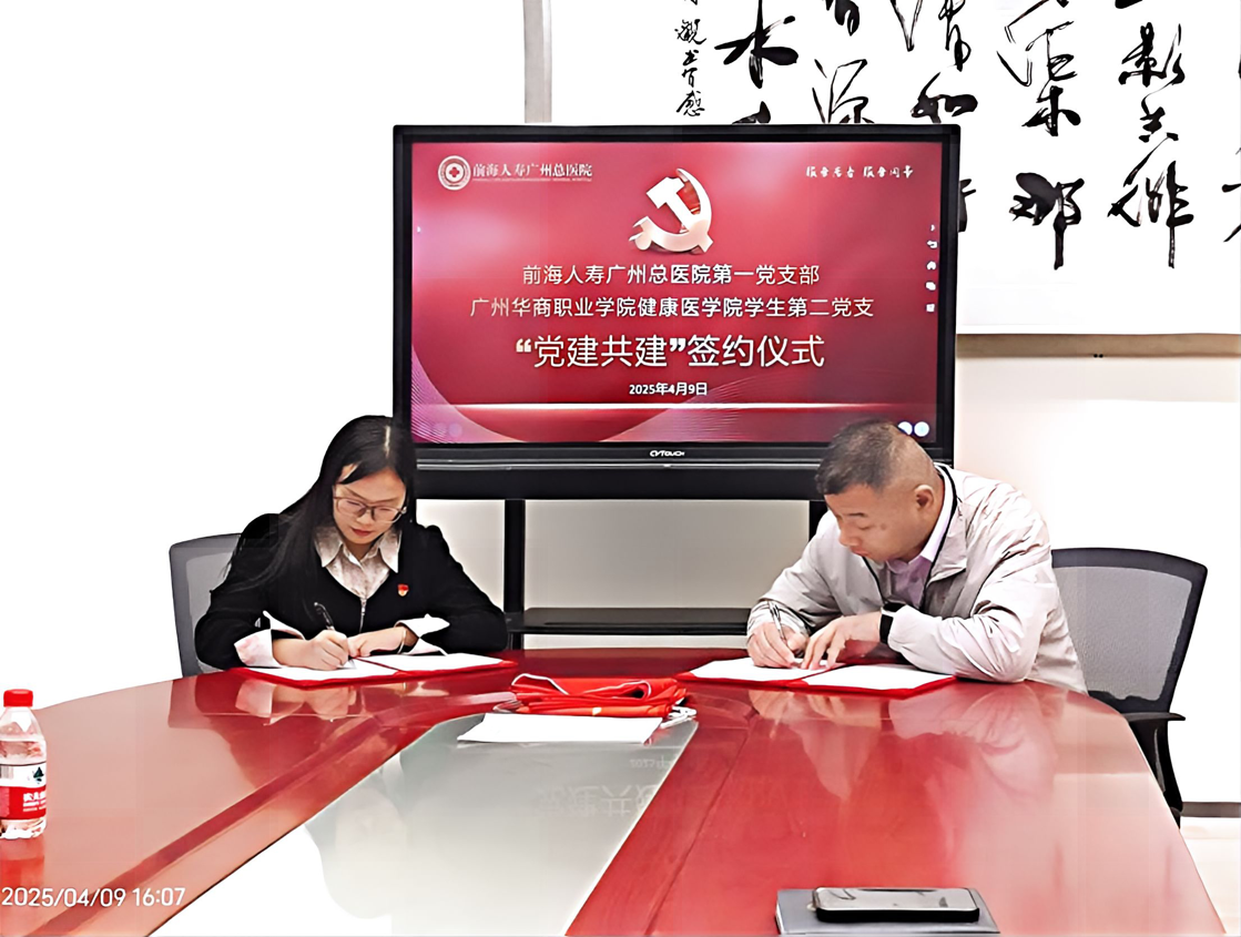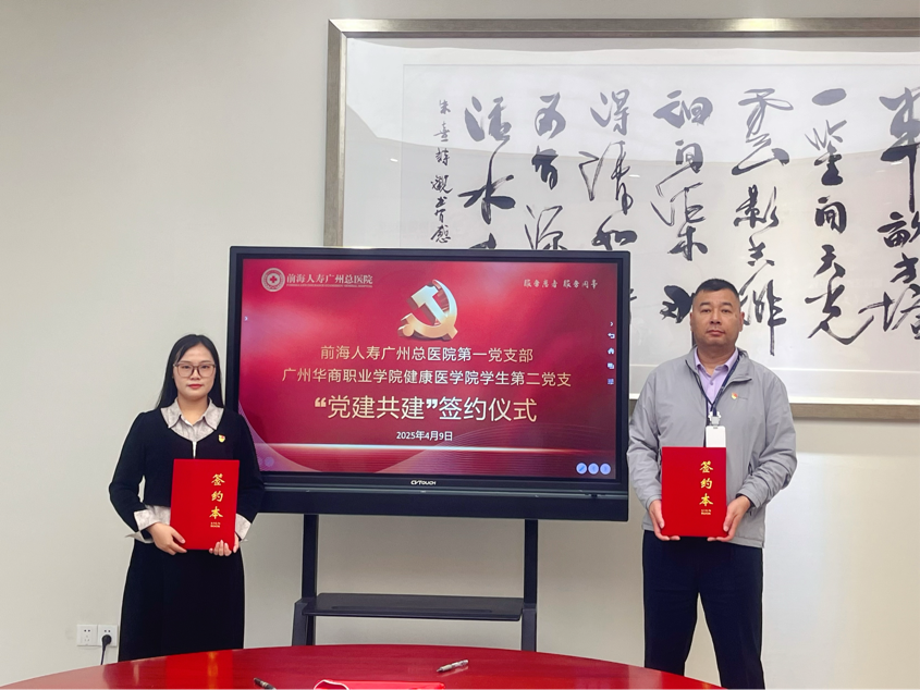 在签约仪式上,健康医学院学生第二党支部书记赵巧鸿老师详细介绍了健康医学院学生第二党支部的组织架构、党建工作特色以及未来合作愿景。前海人寿广州总医院第一党支部的支部书记曹豪则分享了在党建工作引领下医院所取得的显著成就,并展望了未来的发展规划。随后,双方签署了红联共建协议。双方均表示,期待通过深入合作,共同为医疗卫生事业注入新的活力。