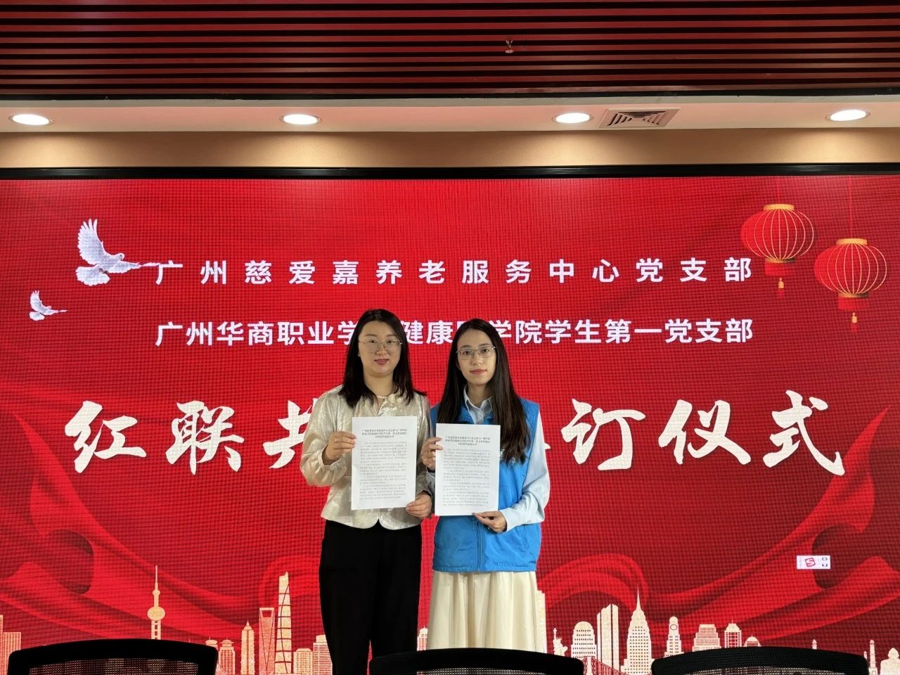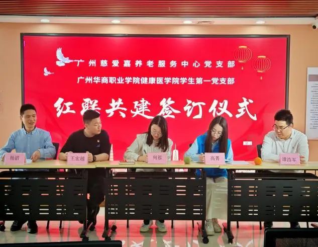 签约仪式现场,在荔湖街公共服务办的指导见证下,健康医学院学生第一党支部与广州慈爱嘉养老服务中心党支部进行签约。出席本次签约仪式的有荔湖街公共服务办主任谭浩军、广州慈爱嘉养老服务中心项目主任高菁、健康医学院学生第一党支部书记何泓、健康医学院党总支组织员王宏越和健康医学院药学教研室主任杨滔,此次结对共建,旨在整合双方资源,发挥各自优势,通过党建引领,共同推动荔湖街乡村健康事业的发展,为荔湖街村民提供更加优质、便捷的健康服务。