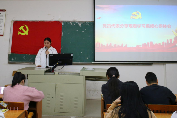 学生党员代表罗瑜同学发言,她表示应将个人的理想追求融入党和国家的事业中,以青春之我,奋斗之我,为民族复兴铺路架桥,为祖国建设添砖加瓦,她还结合自身的学习经历分享了如何在新时期践行党员使命、担当健康卫士的做法,表达了勤学苦练、服务社会的决心。