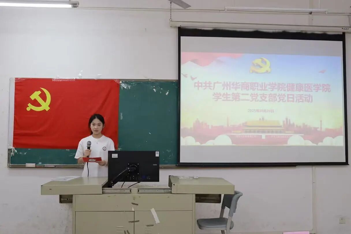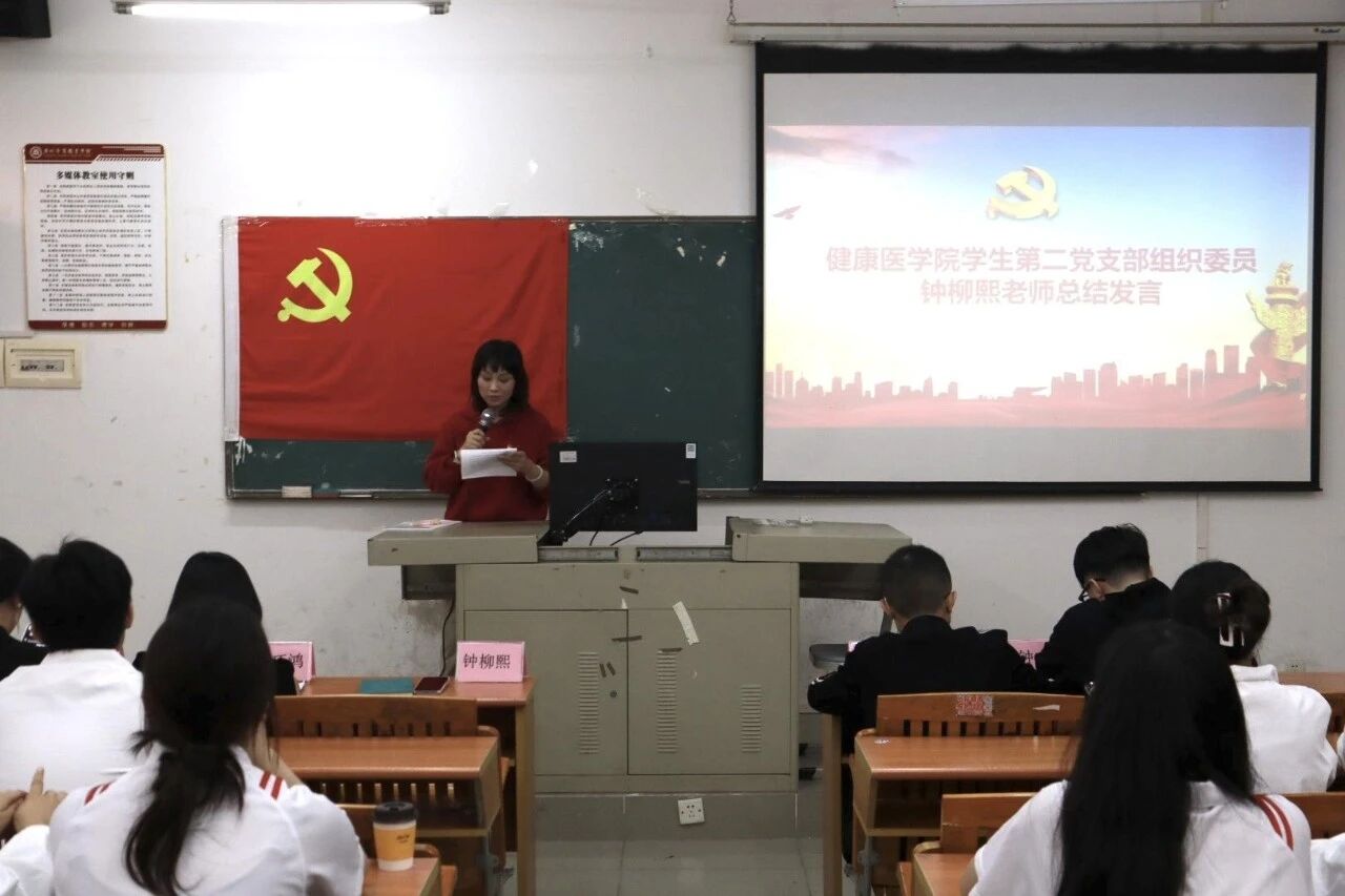 为强化党员理想信念,提升党员凝聚力与战斗力。健康医学院学生第二党支部于2025年10月24日举办了以“庆国庆·颂党恩·当先锋·共奋进”为主题的党日活动。参加本次活动的有健康医学院学生第二党支部书记赵巧鸿老师、宣传委员李倩老师、组织委员钟柳熙老师、辅导员许世龙老师、刘俊禧老师、钟文浩老师以及全体学生党员。本次活动由王丽婉同学主持。