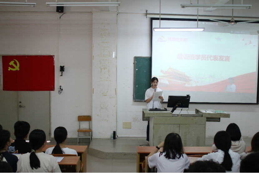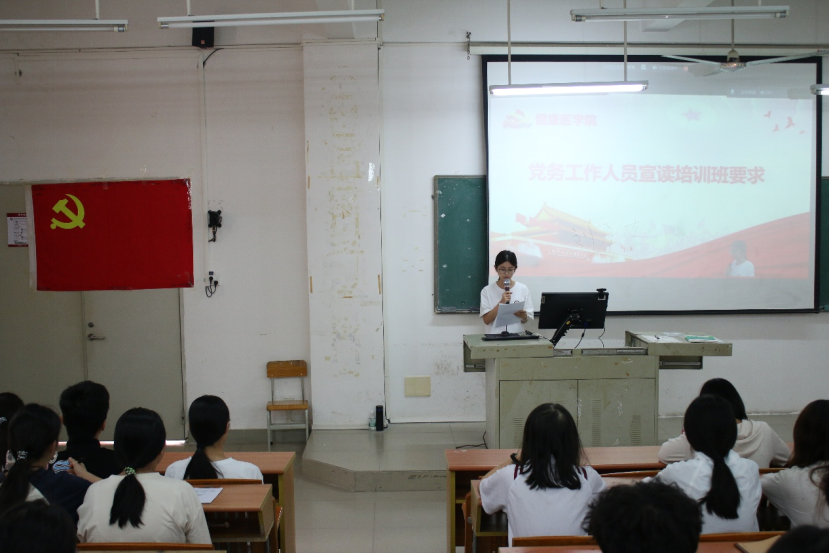 由健康医学院“医心向党”学生党务办公室工作人员代表张巧怡同学宣读本期培训班要求。参加培训的同学要深刻认识端正入党动机的重要性,切实纠正和克服不良动机,自觉遵守党课纪律,严守考核诚信。要不断提升党性修养和思想觉悟,主动接受党组织的培养、教育与考验,把入党追求与大学生学习生活紧密结合,以实际行动争取早日成为一名合格的共产党员。