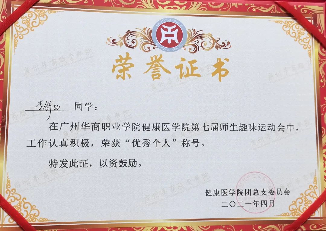 2021年4月获得广州华商职业学院健康医学院第七届师生趣味运动会“优秀个人”
