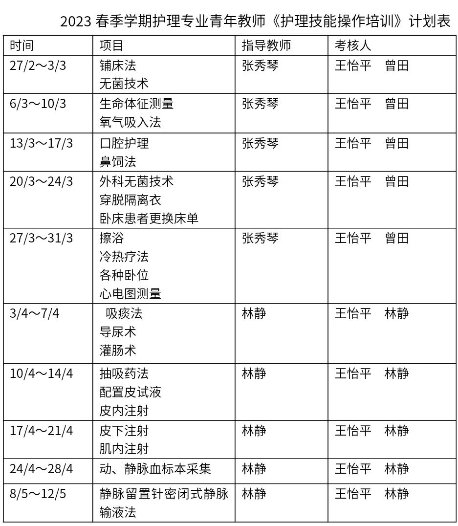 为了保障实训课教学质量,让新教师尽快适应教学,护理教研室制订了青年教师的护理技能操作培训计划(见表1),时间紧任务重,开学第一周在王怡平主任的带领下立即开展对青年教师护理技能培训,按照计划安排边辅导、边练习、经考核验收合格后担任实训课教学。