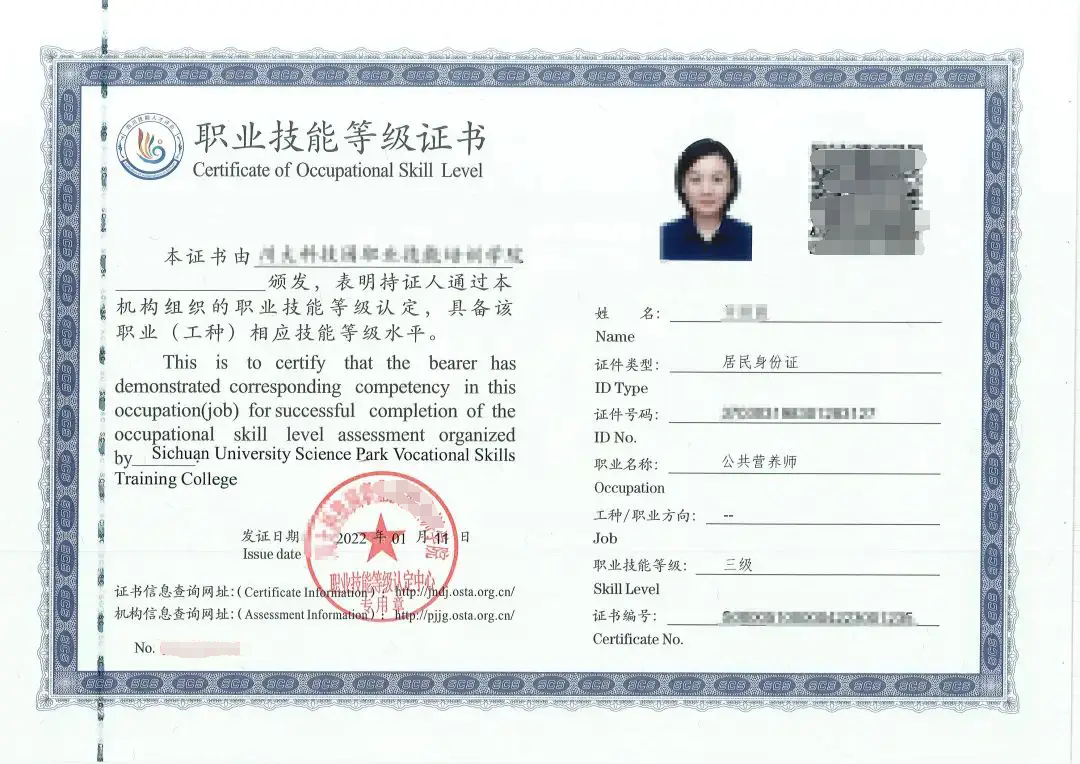 公共营养师三级证书