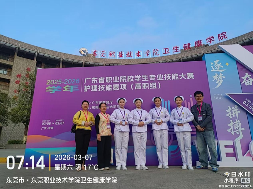 2026年3月6日至7日,2025-2026学年广东省职业院校学生专业技能大赛护理技能赛项在东莞职业技术学院卫生健康学院举行。我院选派黄长荣、曾田两位教师担任指导,带领柯文...