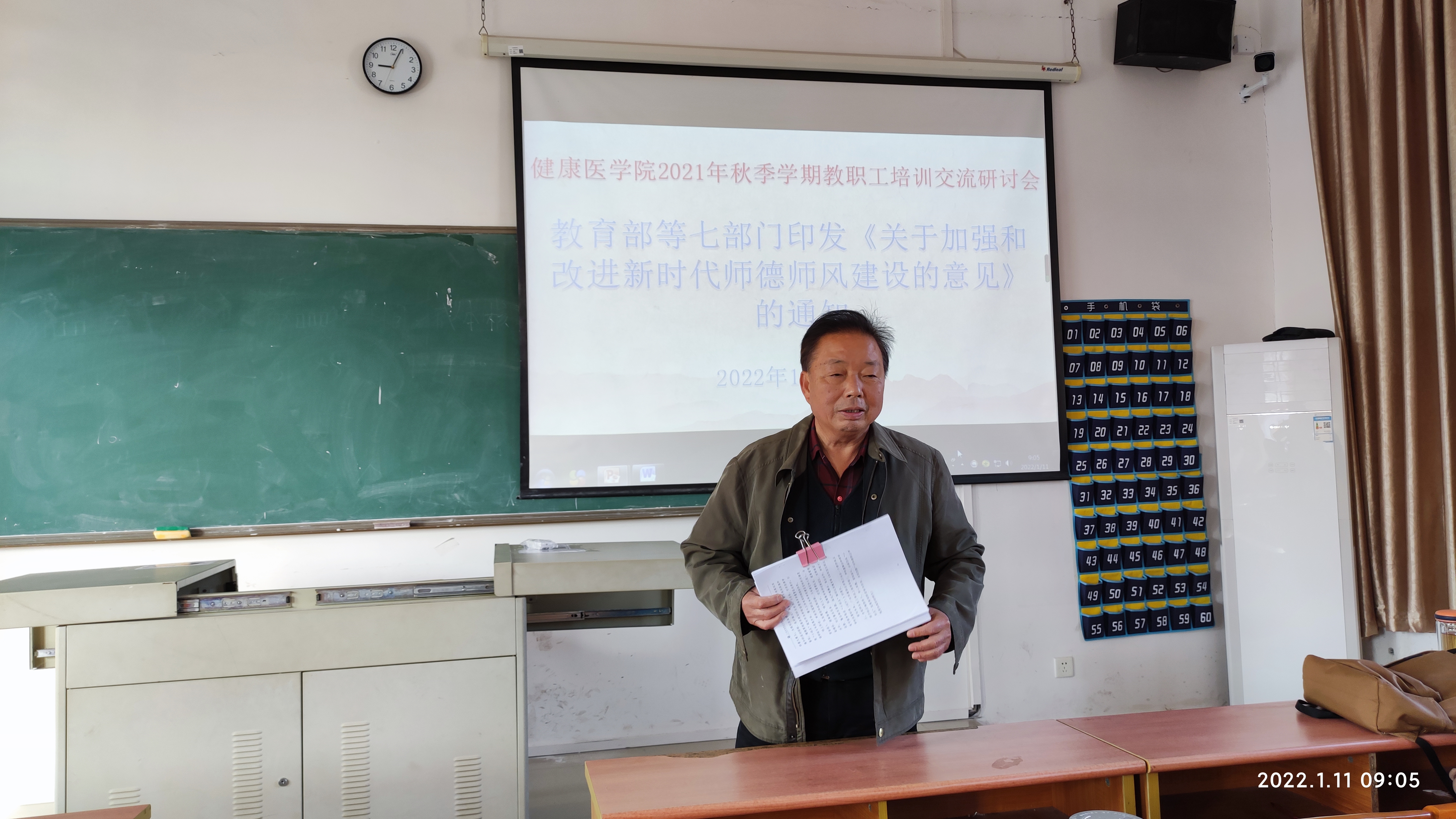 为了进一步加强学院师德师风建设,提升教师课堂授课技能,2022年1月11日,健康医学院在博学楼B506举办2021年秋季学期教职工培训交流研讨会。 温博栋院长组织学习教育部...