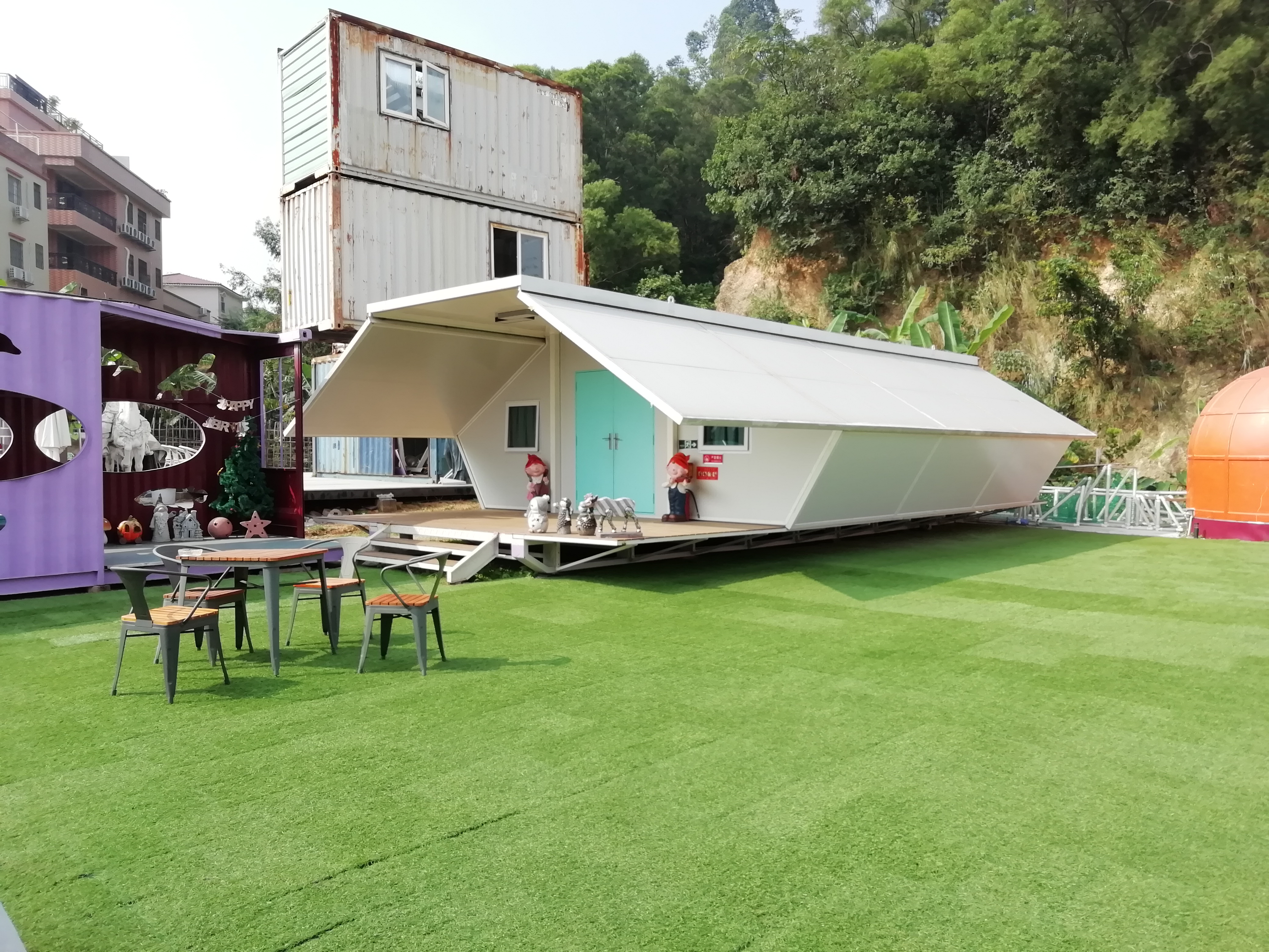 在参观的过程中,李展开会长详细介绍了由集装箱改造而成的卧室、吧台、剧场、游泳池等建筑物,并现场演示了协会的最新发明《纳米隔热防水复合涂料》的应用,指出这种材料可以广泛应用到篮球场地面、运动场坐台等户外隔热表层,希望可以加强与学院的联系,共同开发使用和推广此种材料。