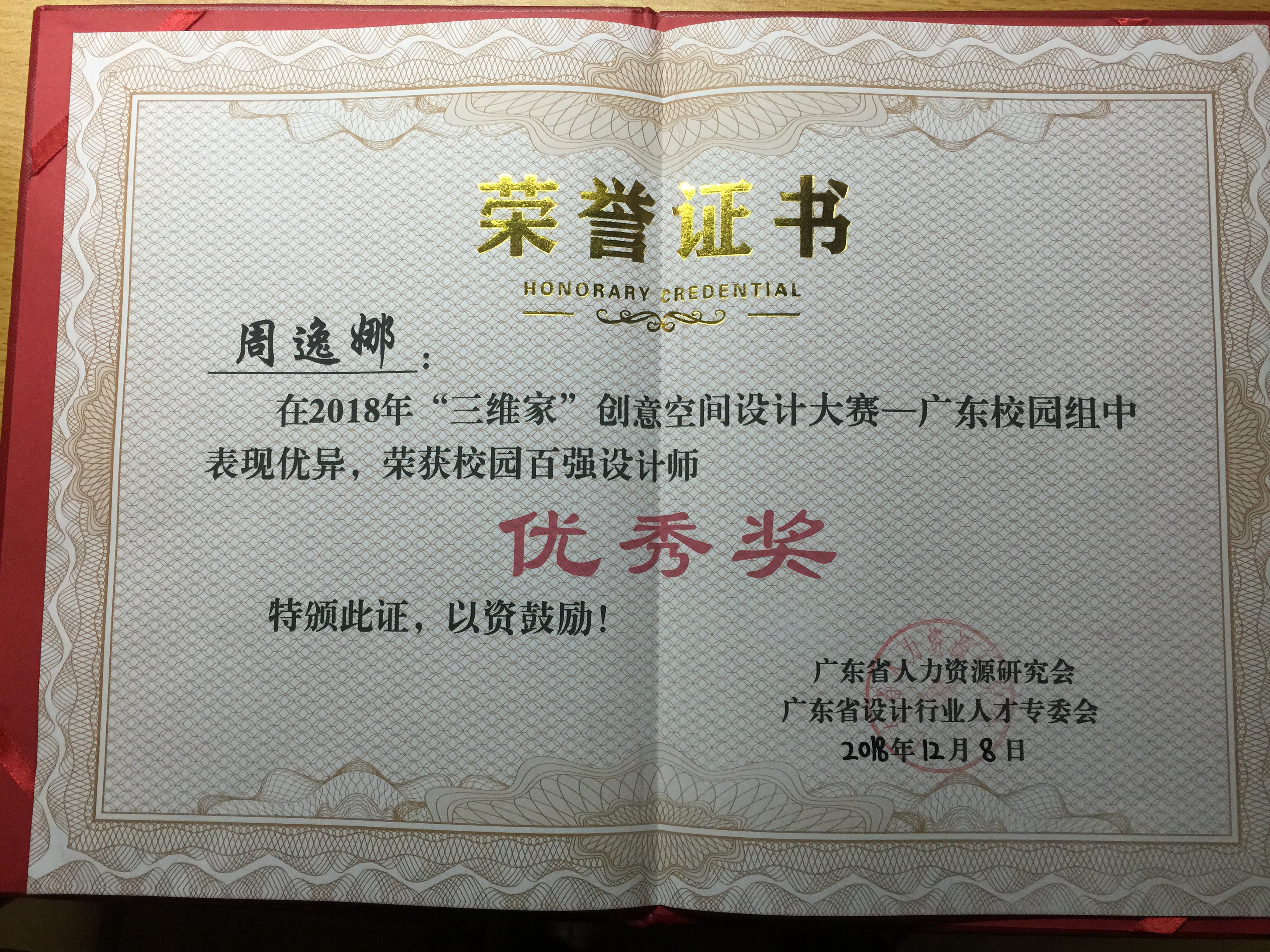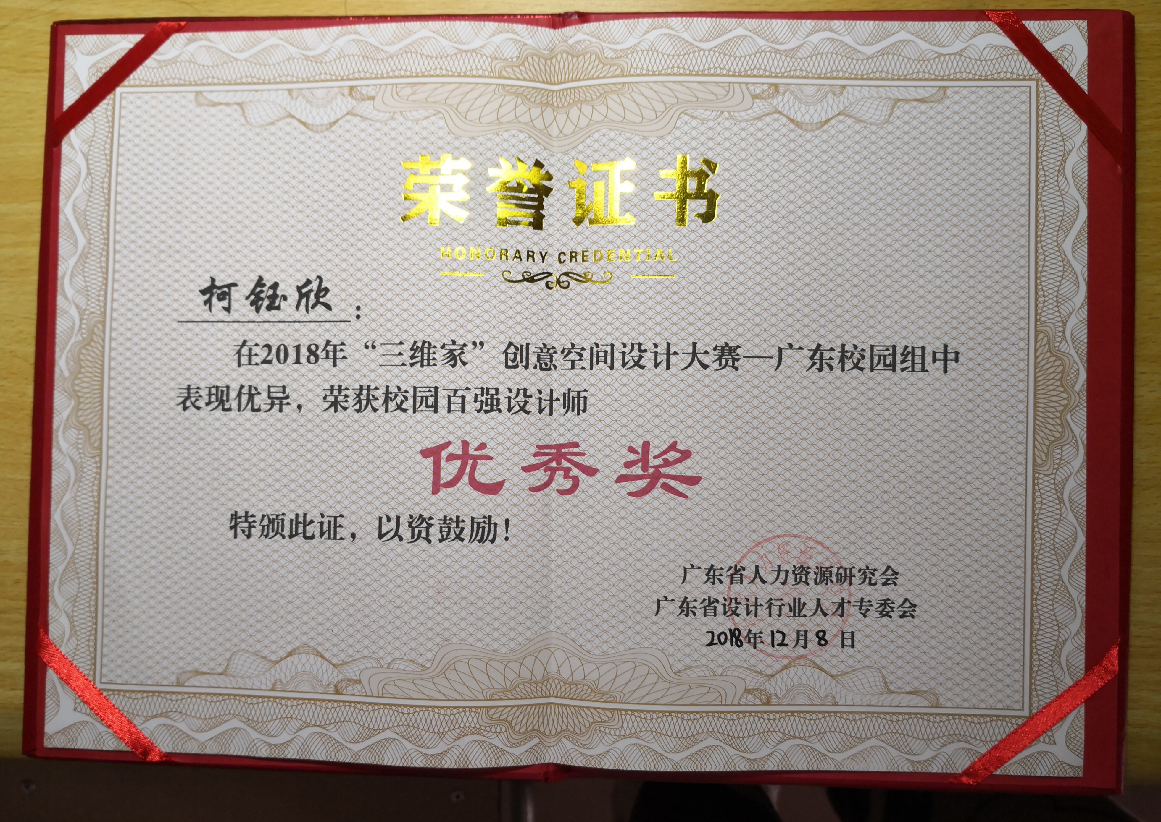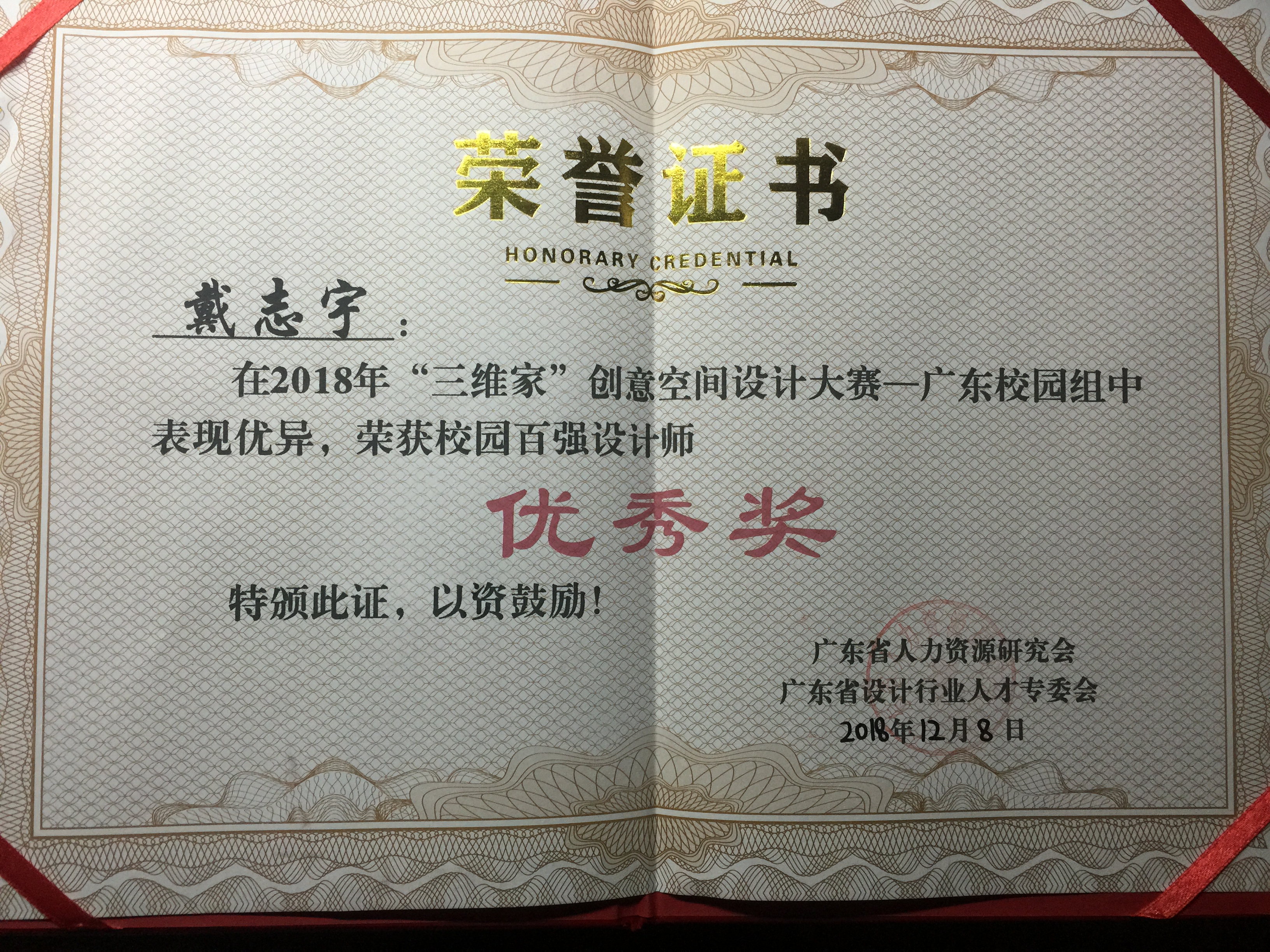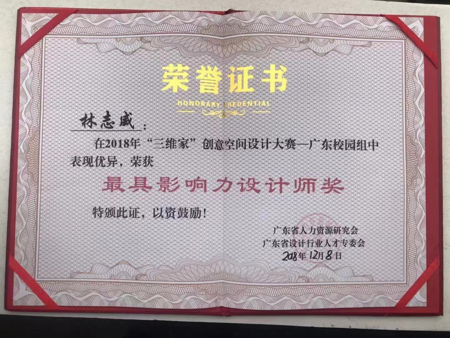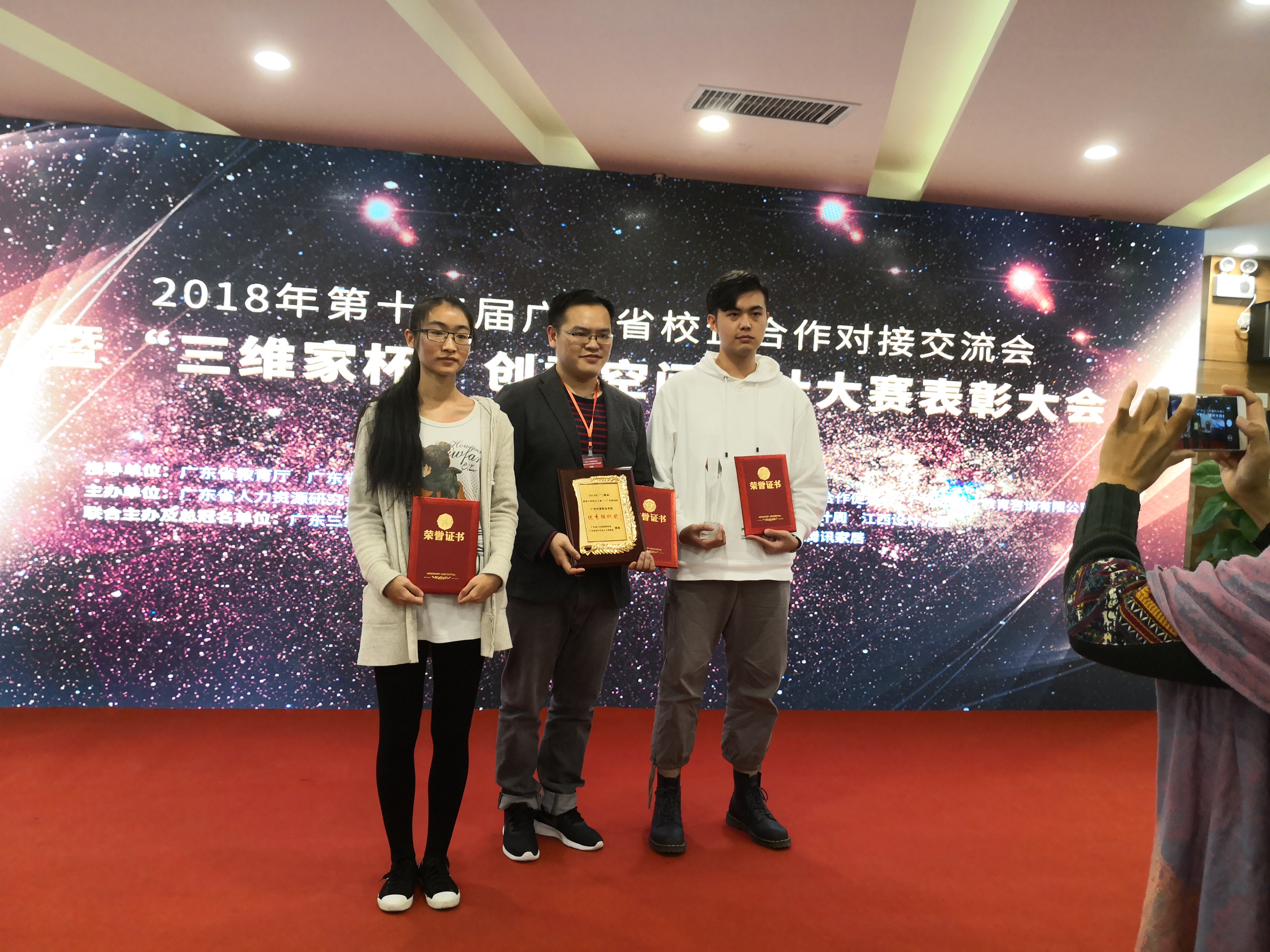 12月8日,2018 年第十三届广东省校企合作对接交流会暨“三维家杯”创意空间设计大赛表彰大会顺利召开,我院荣获 “优秀组织奖”的称号,林志威同学荣获“最具影响力设计师”奖,周逸娜 、柯玉欣 、戴志宇三位同学荣获“百强设计师优秀奖”。 李名亮和李孟冰两位老师荣获“优秀指导教师”奖。