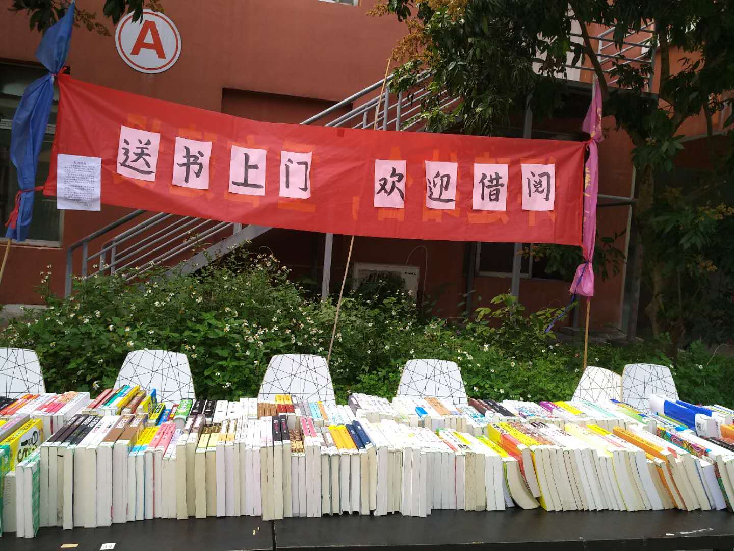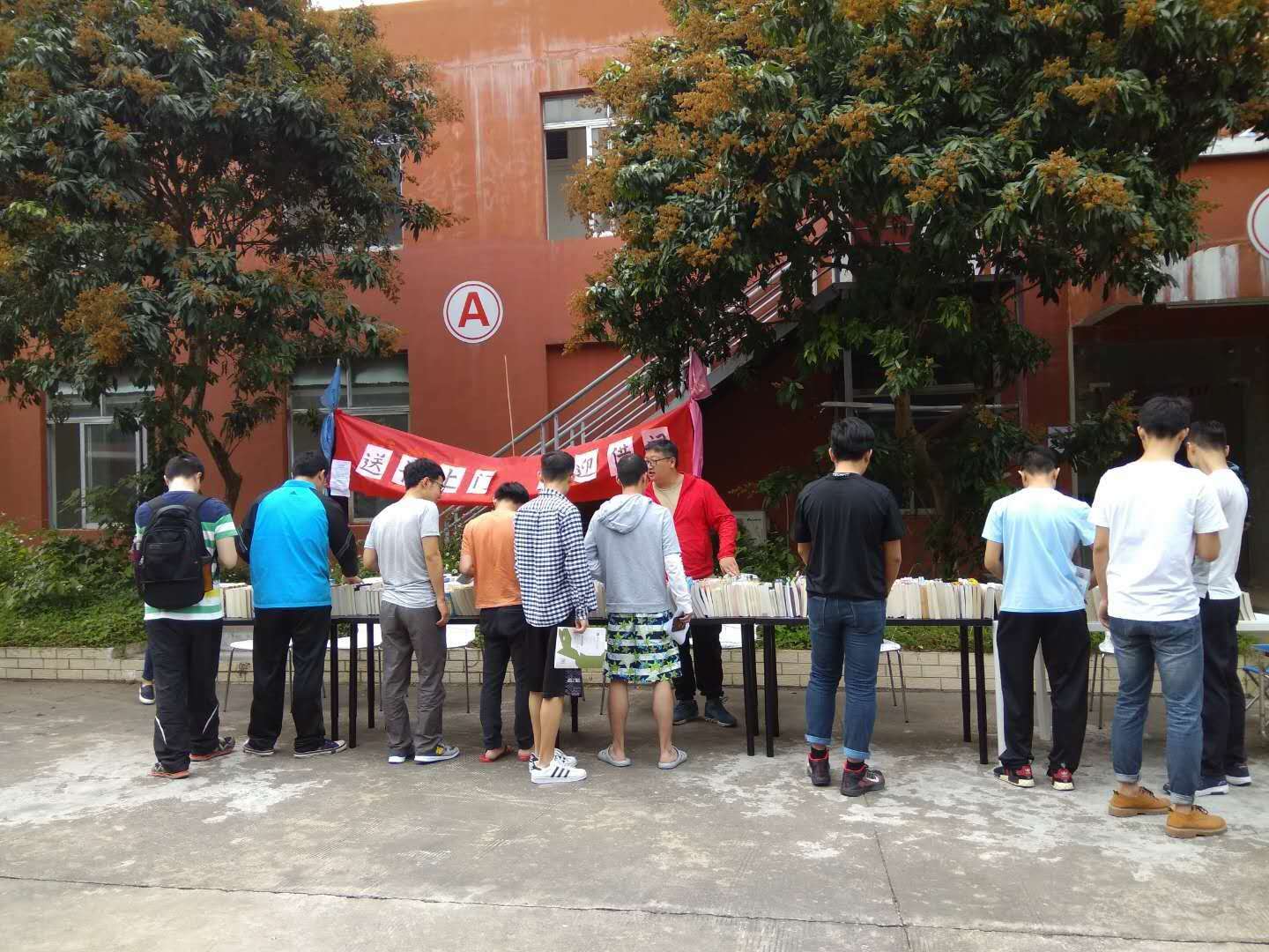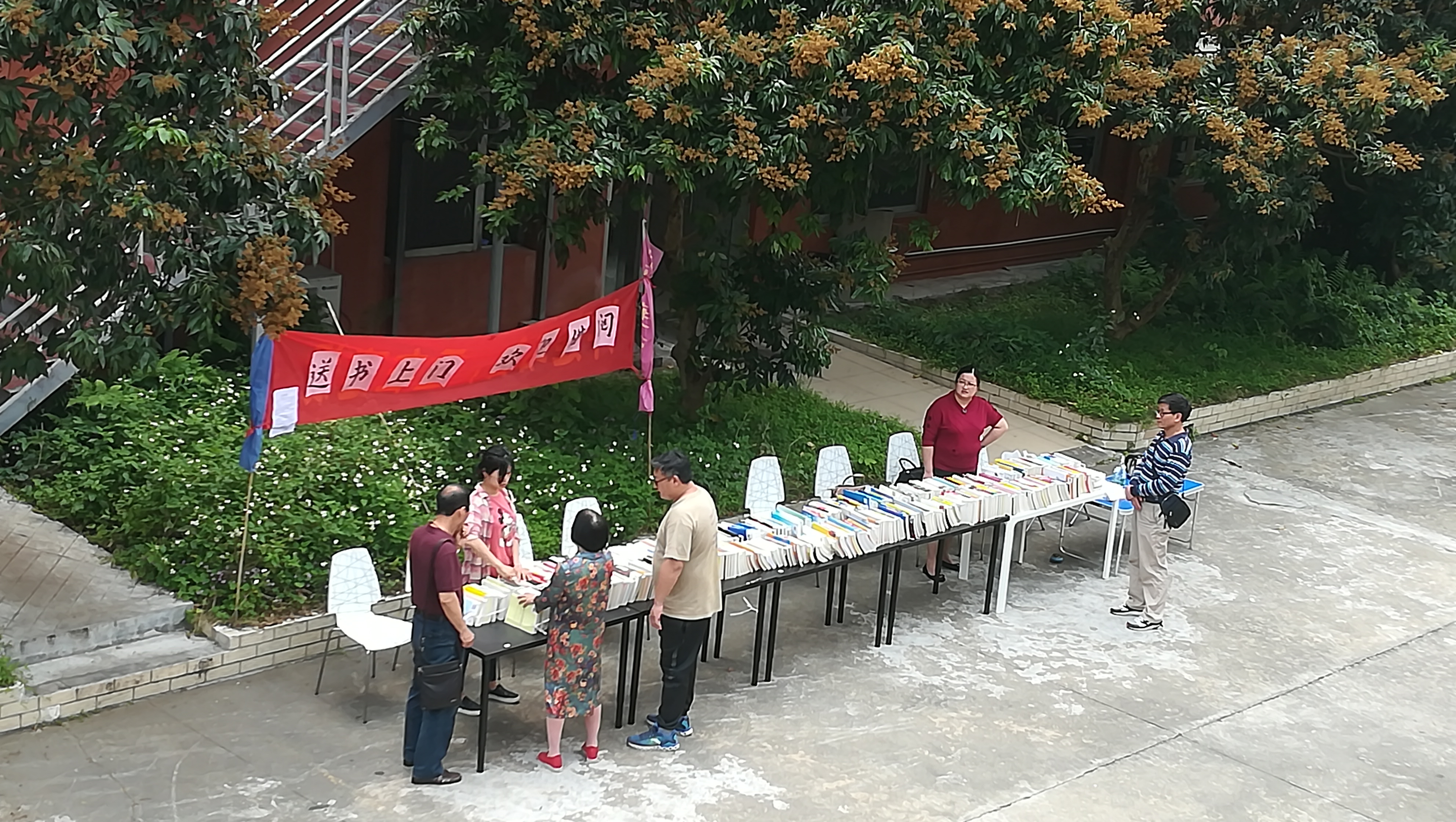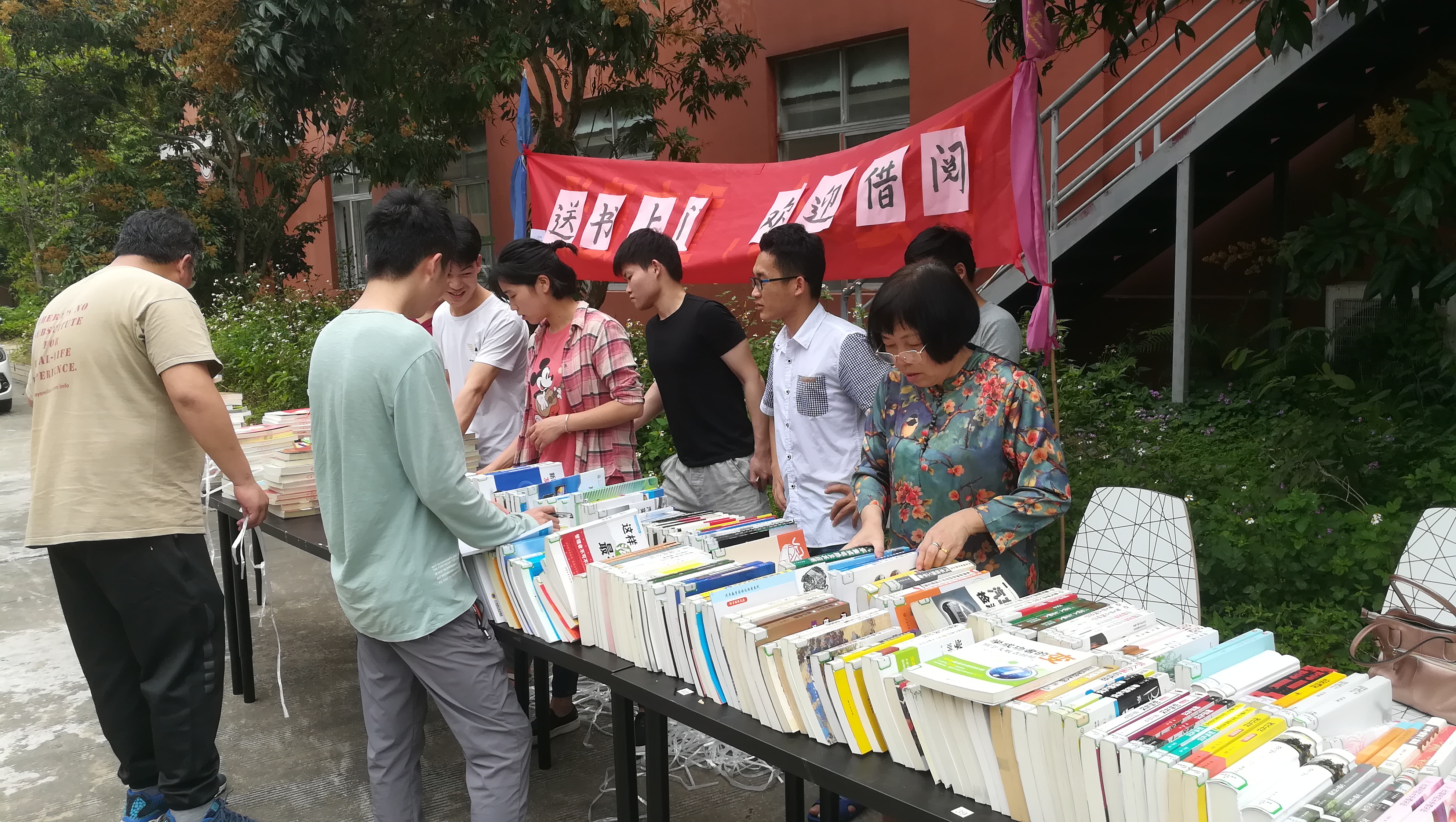 图书馆的老师们与汽车学院的师生们一起把书籍分门别类地一字排开,并立起了一条横幅“送书上门、欢迎借阅”。简单的布展俨然成为了汽车学院校区的一道亮丽风景。现场吸引了不少同学驻足围观,同学们晓有兴致地查找、翻阅自己的心仪书籍,并现场办理了借阅手续。