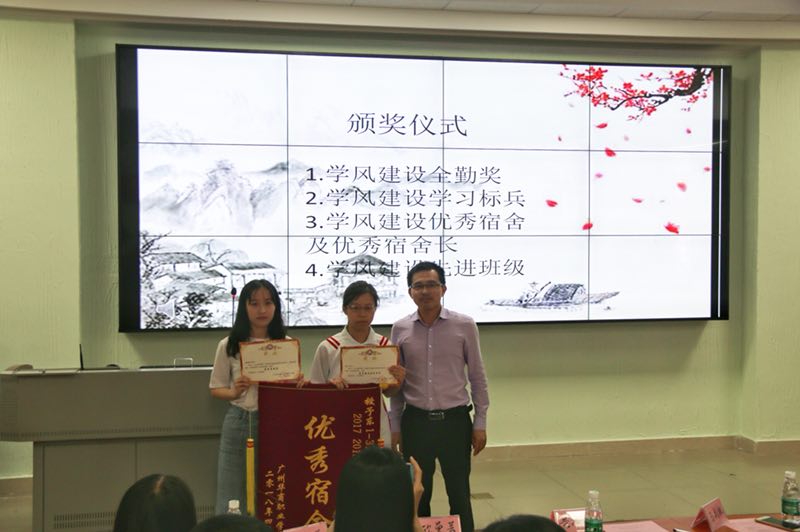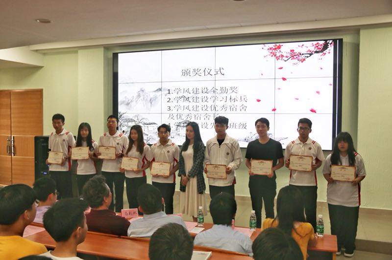 大会伊始,黄泽栋书记为大会致辞并宣读表彰名单,对获奖同学表示祝贺,同时要求与会同学向优秀看齐;接着,马彩祝主任、黄泽栋书记、黄兴中老师、欧曼芸书记分别为获得优秀先进班级(16建筑装饰1班、17建筑装饰1班)、优秀文明宿舍(东1-315)、学习标兵、全勤奖的优秀集体及个人颁奖;随后,容爱贤同学、潘秀文同学和林海滨同学分别作为学习标兵、优秀文明宿舍、优秀先进班级代表上台发言,从个人的学习经验、宿舍的良好氛围、集体的团结奋进三个方面分别作汇报,三位同学都不约而同地对系部提供平台、教师谆谆教诲表示深深的感恩。