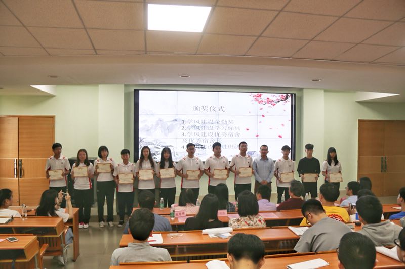 表扬先进,树立榜样,4月3日下午4点,我系于博学楼C101召开2017-2018学年第一学期学风建设评优评先表彰大会,出席本次大会的领导有我系马彩祝主任、党总支黄泽栋书记、教学助理黄兴中老师、团总支欧曼芸书记、各年级辅导员及各班班主任。