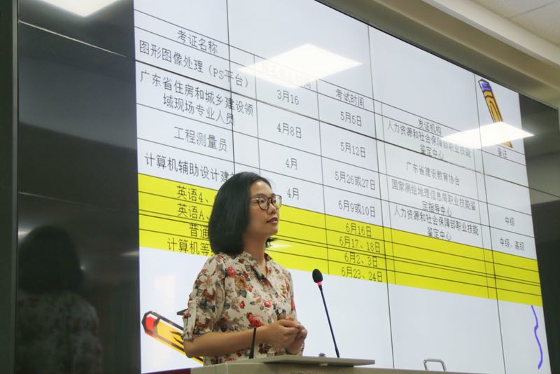 会上,马彩祝主任为同学们分析社会就业的形势与政策,详述专业技能证书含金量和相关用途;随后,黄兴中老师以考证时间主线为同学介绍相关证书,希望同学们合理安排时间,充分复习;接着,丘艳燕老师和邓老师为同学们详细介绍各类证书考试内容及就业方向,让同学们详细了解相关证书。