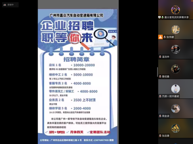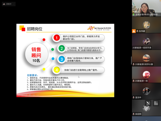 在会议上,广州嘉众汽车自动变速箱有限公司陈培娜人事经理和广州嘉众汽车自动变速箱有限公司曾宪武总经理在线上会议中围绕招聘岗位类型、岗位要求、实习条件、免费岗前培训、实习和就业薪资、晋升途径、未来职业发展规划等方面,进行全方位的解读和指导,并为有兴趣的同学预留联系方式和沟通的平台。
