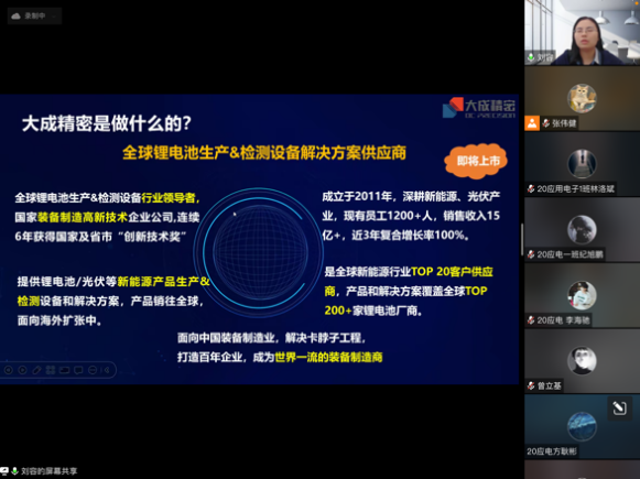 会议的开始深圳大成精密设备股份有限公司(东莞松山湖)刘容招聘经理首先介绍了圳大成精密设备股份有限公司(东莞松山湖)的简介、招聘岗位、岗位要求及职责、薪资结构以及公司的发展方向。向同学们详细介绍了薪酬及福利待遇以及公司试用实习员工的管理办法,鼓励同学们在职期间学历进修。