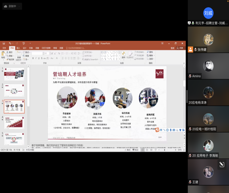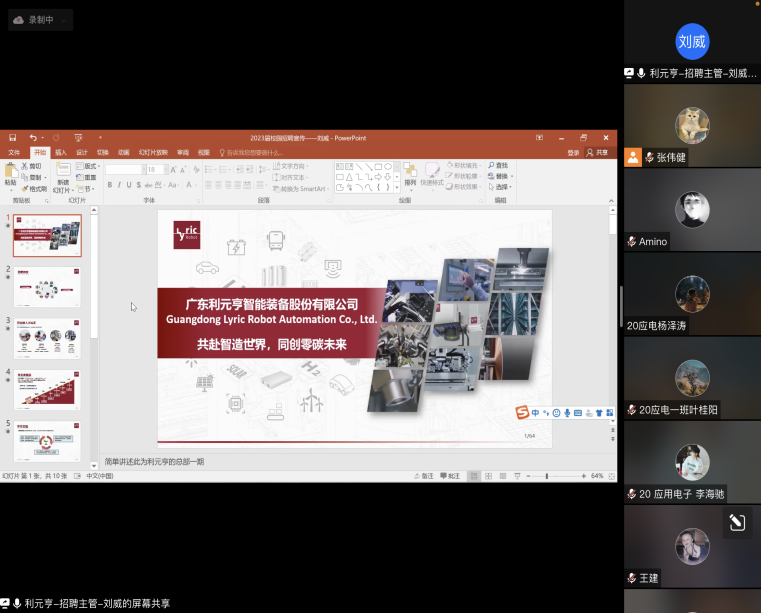 在线上招聘会中,首先介绍了广东利元亨智能装备股份有限公司的简介、招聘岗位、岗位要求及职责、薪资结构以及公司的发展方向。向同学们详细介绍了薪酬及福利待遇以及公司试用实习员工的管理办法,鼓励同学们在职期间学历进修。