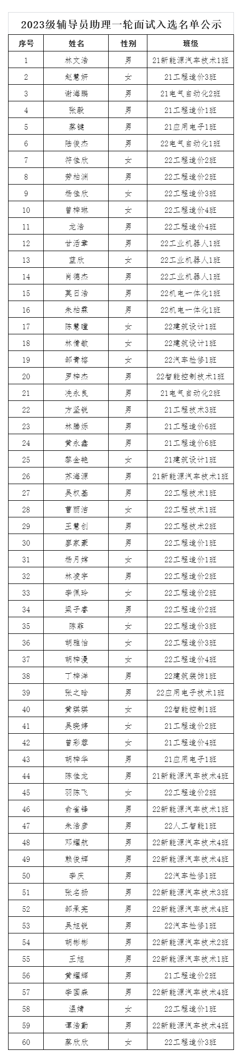 以上60名同学为智能工程学院2023级辅导员助理一轮面试入选名单,现进行公示,最终名单以2023年9月的考核为准。