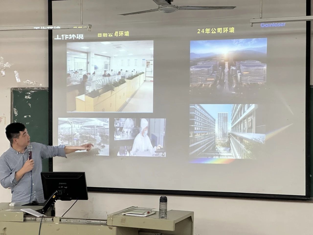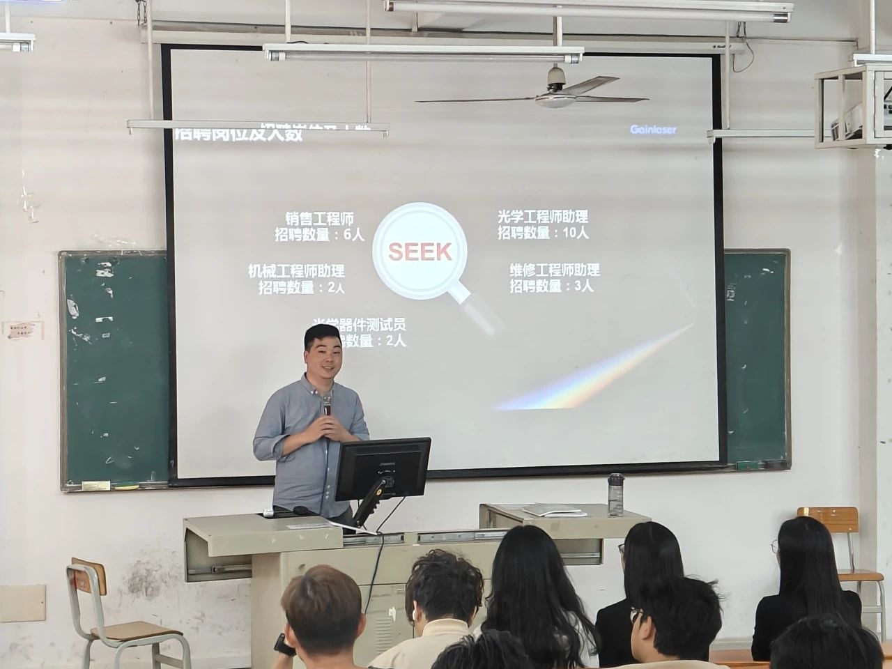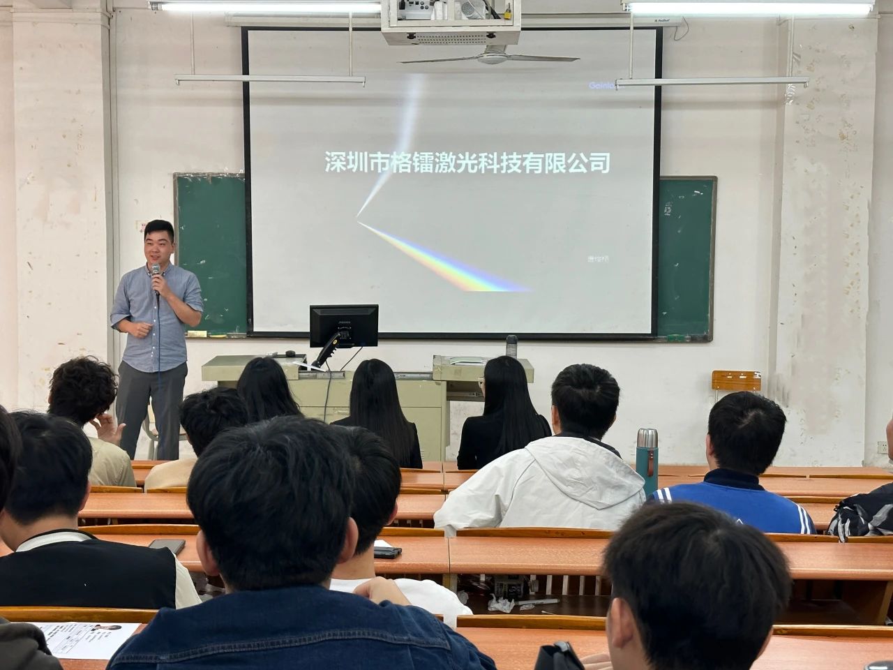宣讲招聘会上,深圳市智坤源实业有限公司总经理兼深圳市滕富泰科技有限公司运营总经理兼深圳市格镭激光科技有限公司运营总经理唐焌栩通过PPT向同学们详细地介绍了企业背景、招聘的各个岗位、薪资待遇与优厚的员工福利等问题,鼓励同学们可以根据自身优势,选择适合自己的岗位。格镭激光是坚持技术创新,始终保持高水平研发投入,沉淀核心技术;公司生产的激光产品广泛应用于激光加工、环境监测、生物监测、激光医疗、科学研究、激光测量等领域。并阐述力量源自专业,利用专业技能为客户创造价值是格雷激光科技的根本宗旨。