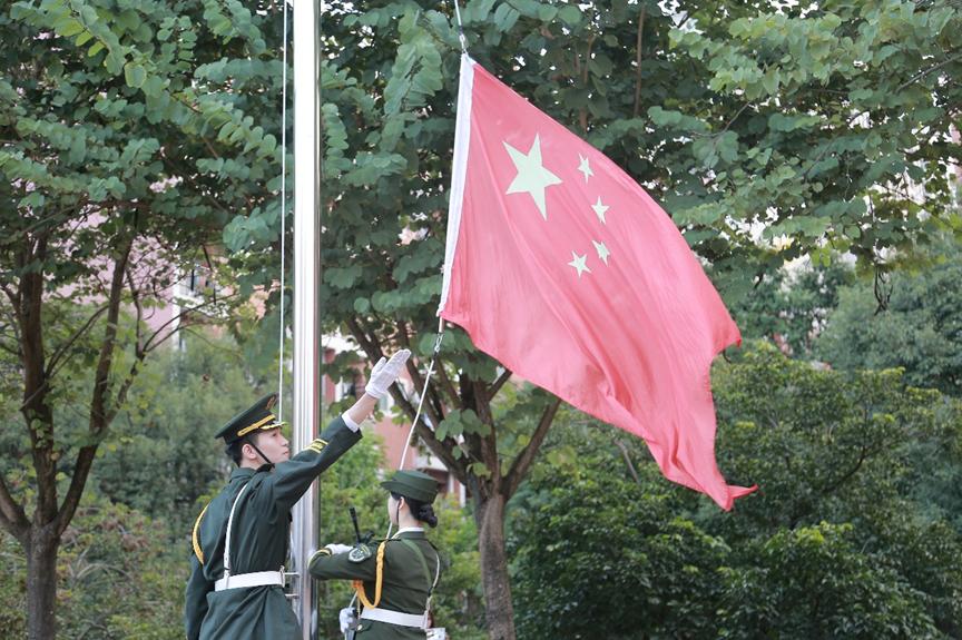 清晨,五星红旗迎面而来。在《义勇军进行曲》伴奏下五星红旗缓缓升起,全体师生齐声高唱中华人民共和国国歌,庄严肃穆,爱国之情在大家的心中激荡。宪法晨读活动在庄严的国歌声中拉开序幕。