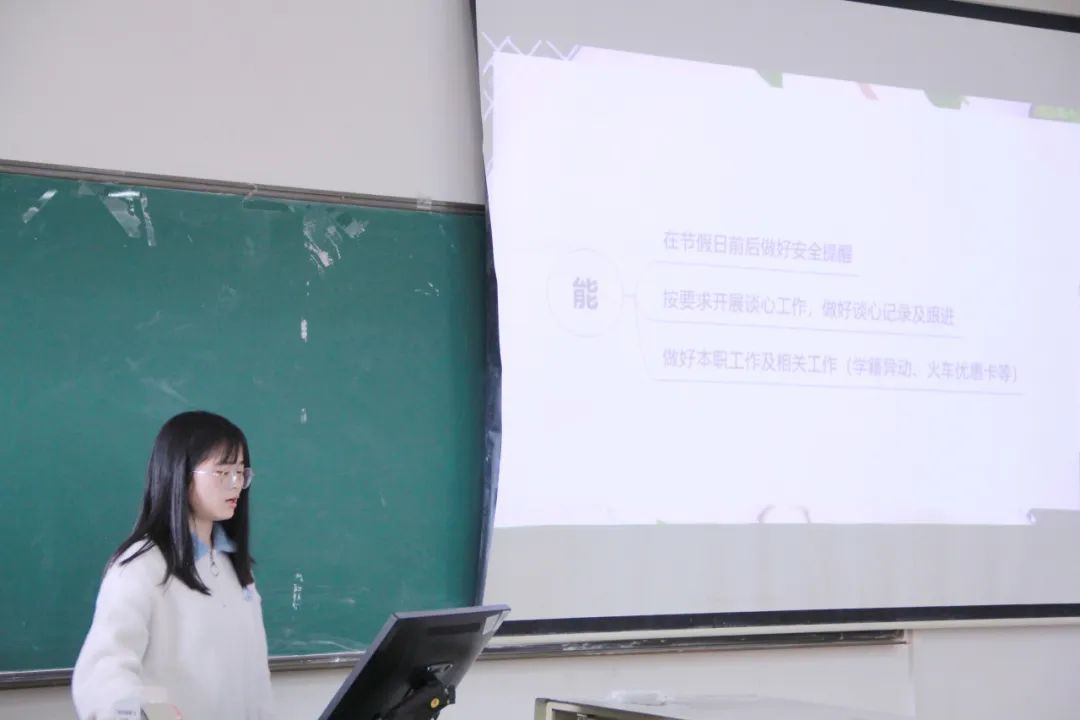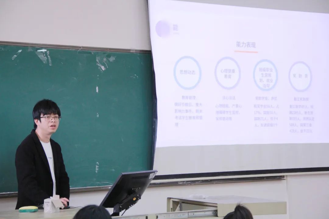 会上,辅导员们结合自身工作实际情况,从“德、能、勤、绩、廉”五大方面,通过PPT展示和演讲相结合的方式进行了工作述职。他们不仅对学生在思想理论教育和价值引领、党团建设和班级管理、日常事务处理、突发事件应对、学业指导与心理健康教育以及职业规划与就业指导等学生日常管理工作和各自所负责的专项工作板块进行了量化总结,还反思了自身在工作中存在的问题与不足。同时,他们还提出了下一学年的工作思路和成长路径,充分展现了辅导员队伍锐意进取、实干担当的精神品质,并彰显了他们扎实的能力素养和良好的精神风貌。