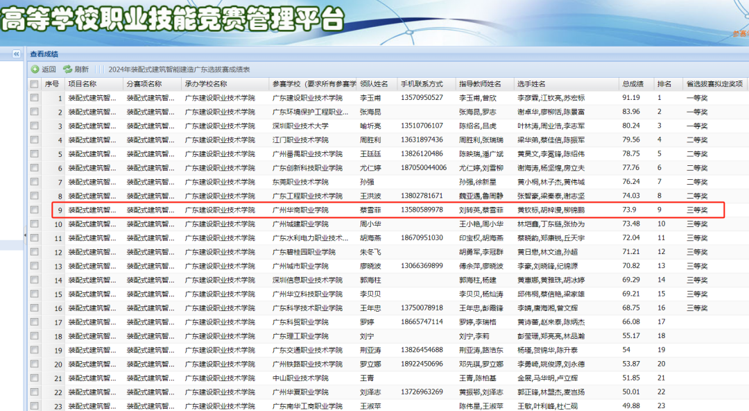 2023-2024年度广东省职业院校学生专业技能大赛装配式建筑智能建造赛项于2024年1月15日-17日在广东建设职业技术学院(清远校区)顺利举行。我院刘转英、蔡雪菲两位指导老师带领22级工程造价专业柳锦鹏、胡梓漫、黄钦标3名学生参与了大赛的角逐。经过两天的激烈竞争,我院参赛队伍在25支参赛队伍中以第9名的成绩获省级三等奖。