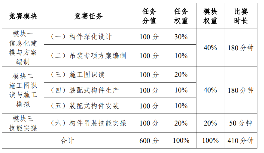 装配式建筑智能建造赛项分为信息化建模与方案编制、施工图识读与施工模拟、技能实操三个竞赛模块,时长共410分钟,其任务权重及用时安排如下图:
