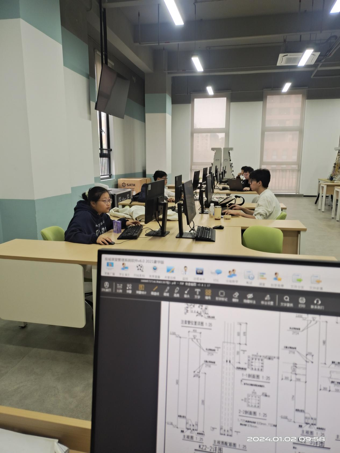 装配式建筑智能建造赛项内容覆盖面广,从设计、生产到施工全过程考核,以建筑产业转型升级为抓手,赛项结合装配式建筑智能建造相关岗位对人才的知识、技能、素养要求,全面对接建筑产业数字化、工业化、智能化发展新趋势。我院刘转英、蔡雪菲两位指导教师从2023年10月接到比赛任务开始就系统规划培训安排,从Planbar深化设计软件、广联达装配式智慧学堂施工与生产模拟再到吊装实训技能实操三部分,分工合作指导学生。