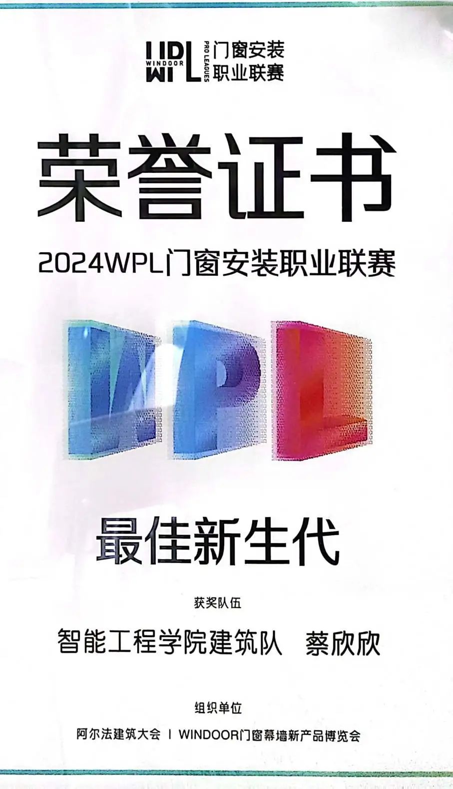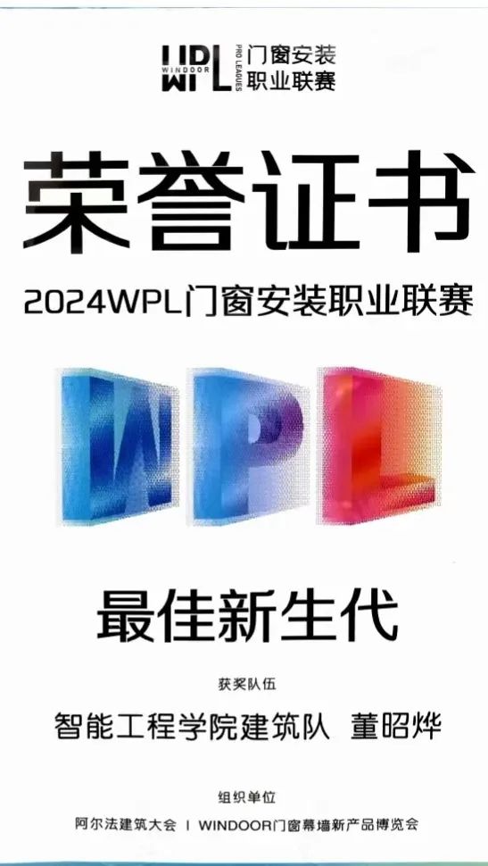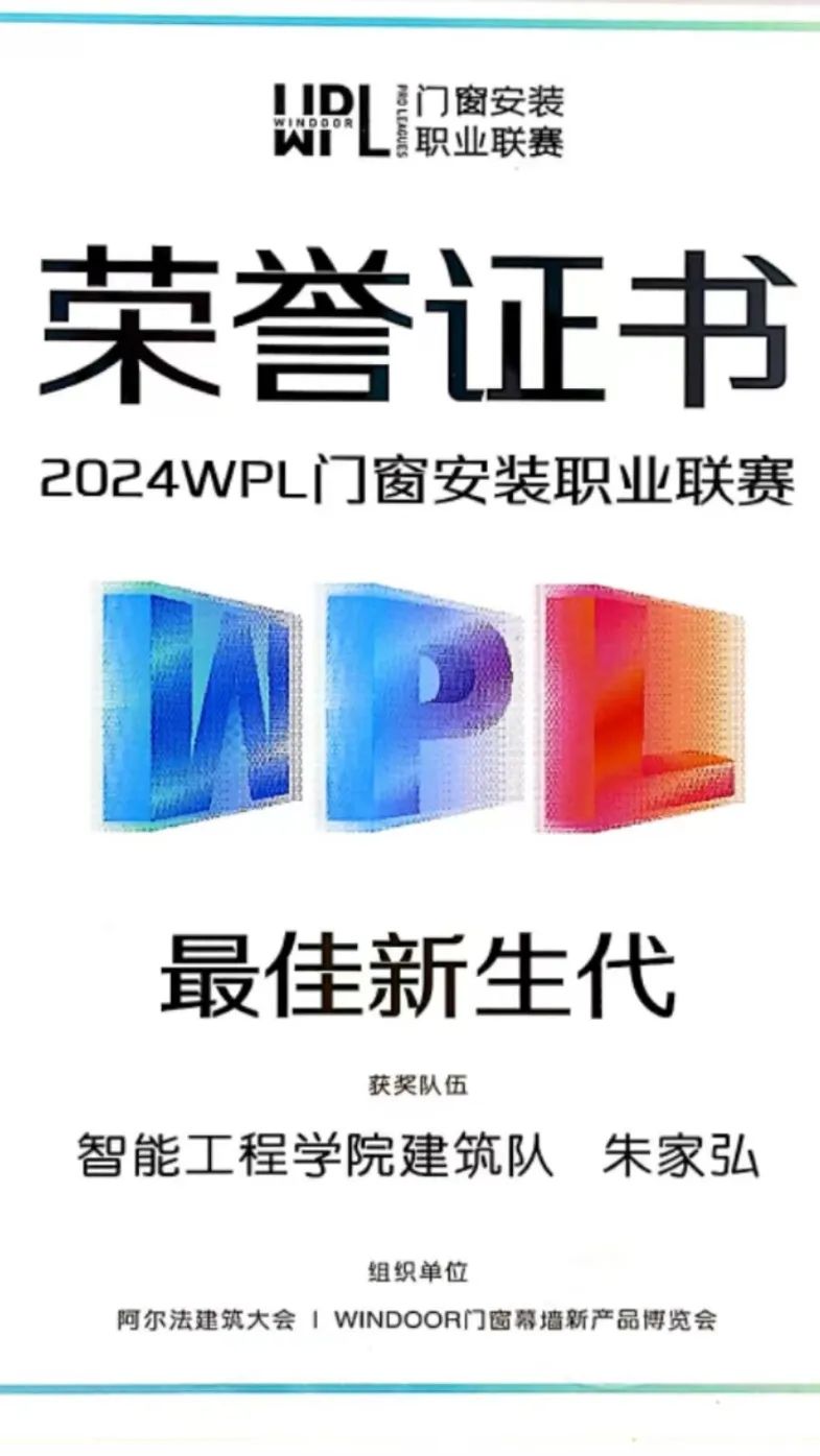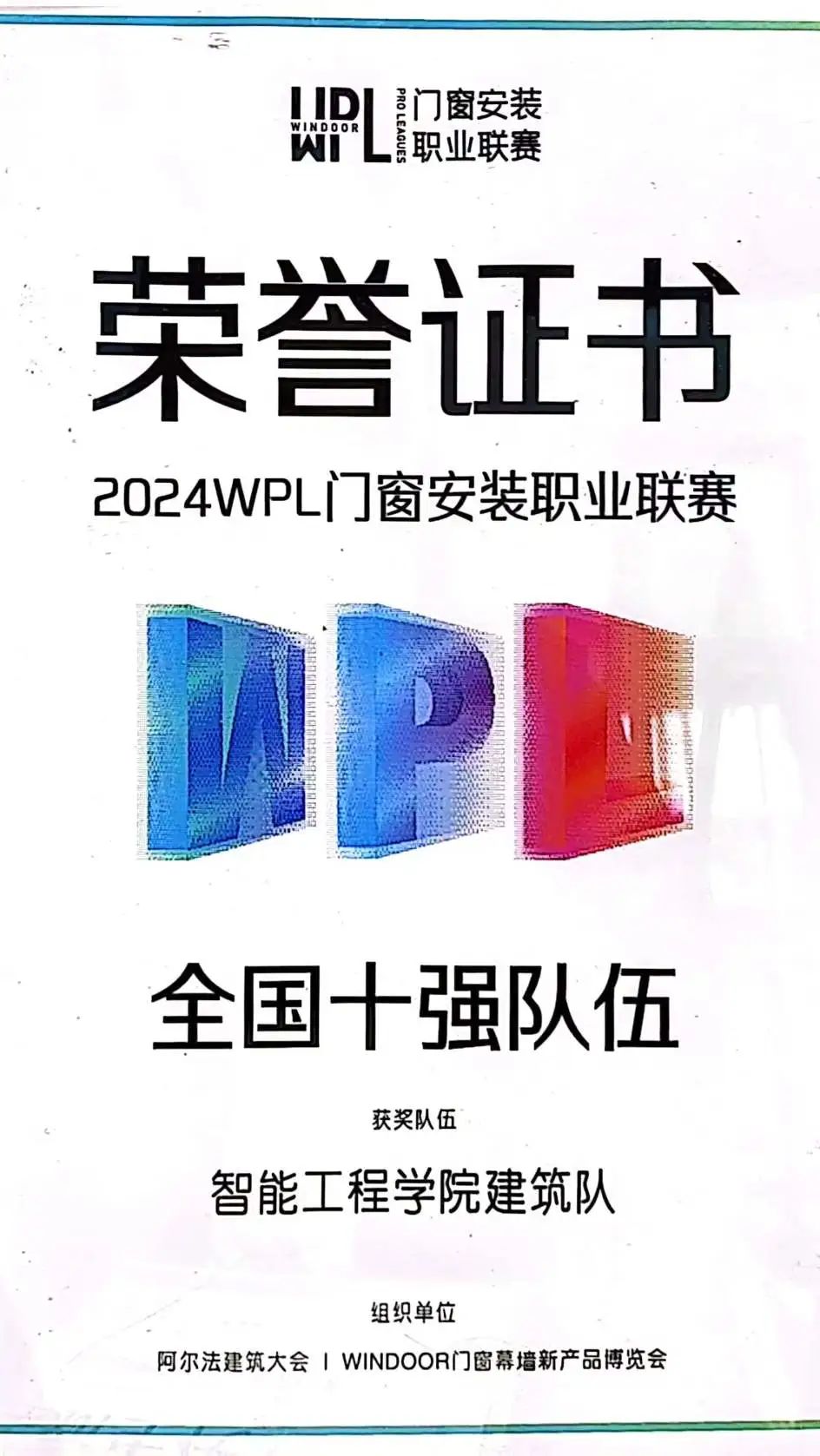 2024年3月11日,智能工程学院22级工程造价的董昭烨、朱家弘、蔡欣欣三名同学在本学院罗姗姗和朱文亮两位老师的带领下,作为“智能工程学院建筑队”战队参加了2024WPL门窗安装职业联赛,荣获全国十强队伍,学生获得最佳新生代称号。