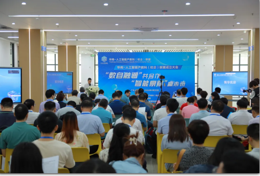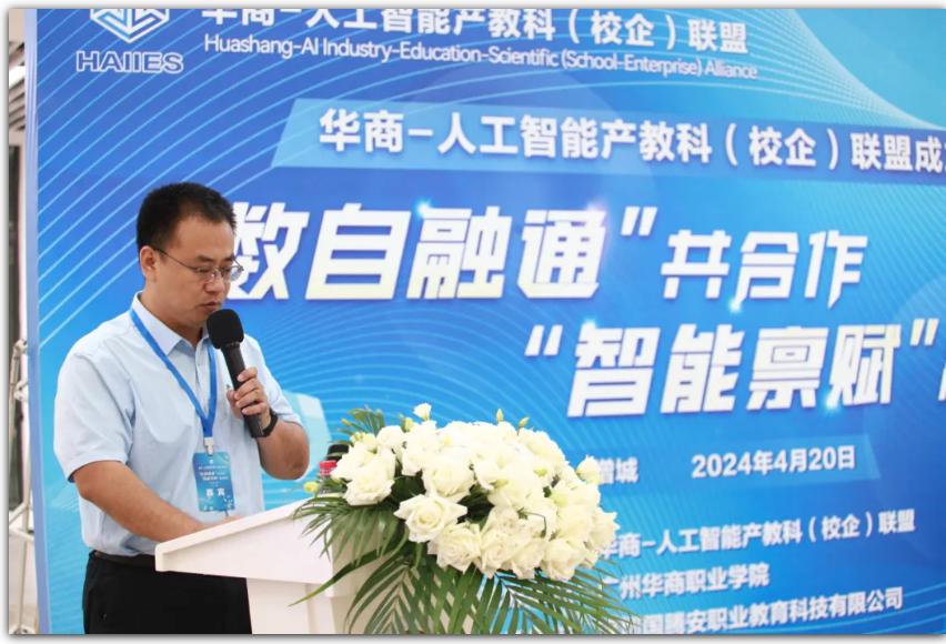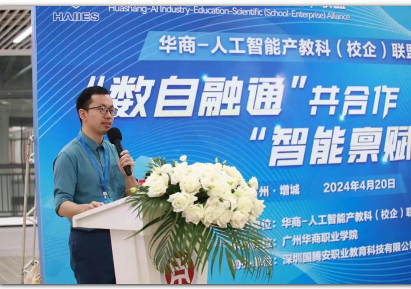 为推动学校管理流程的数字化转型,深化校企合作,促进人工智能产业与高校人才培养体系的融合,引领教育变革与创新,深入探讨人工智能技术应用领域的人才培养模式,4月20日,华商-人工智能产教科(校企)联盟成立大会在华商创新与科技中心三楼大厅隆重举行。广州华商职业学院副校长孙虎、智能工程学院院长黄河,广东建设职业技术学院前任院长赵鹏飞教授,广东工贸职业技术学院党委书记何汉武,刘志远校企合作项目总监,广州高谱技术有限公司副总经理李会水等成员代表出席大会。