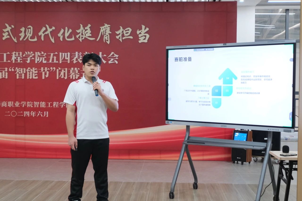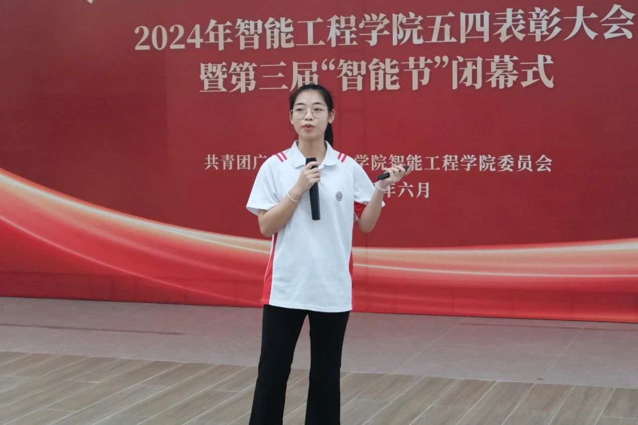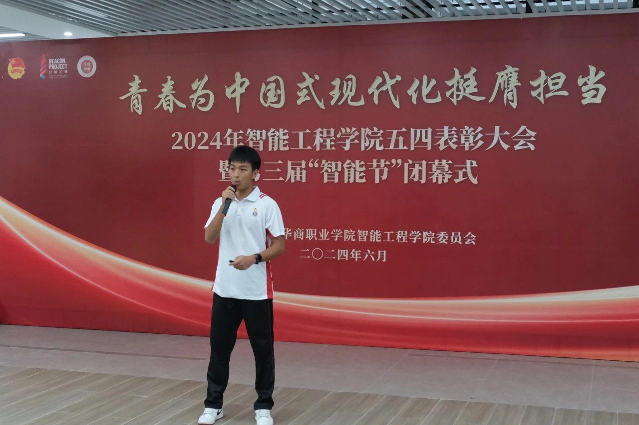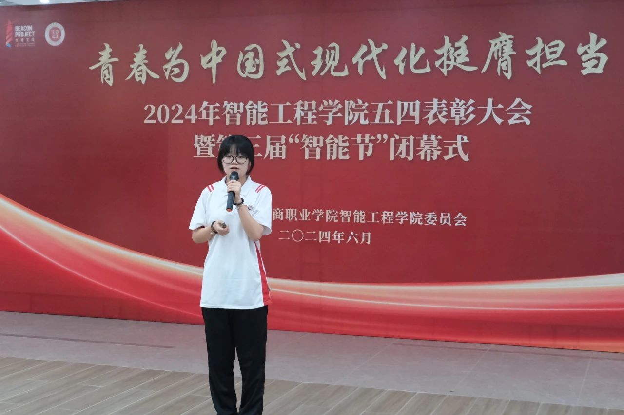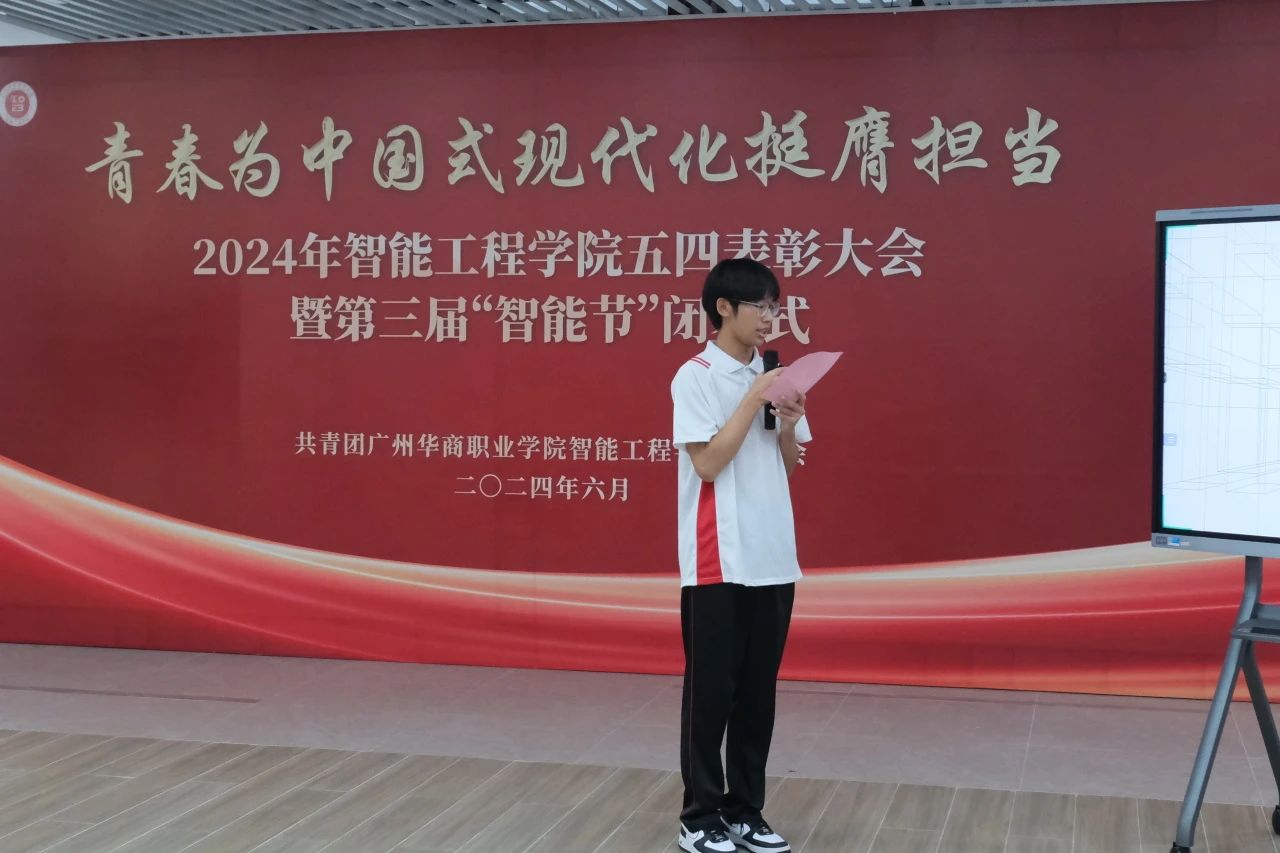 周燕清老师宣读《广州华商职业学院智能工程学院2024年“五四”评优表彰决定》。她表示,希望受到表彰的组织和个人珍惜荣誉,戒躁戒躁,充分发挥先锋模范作用,不断取得新的成绩。广大团员青年要向受表彰的集体和个人学习,贯彻习近平新时代中国特色社会主义思想,继承弘扬“五四”精神,坚定信念,与时俱进,开拓进取,不忘初心,牢记使命,勇毅前行。
