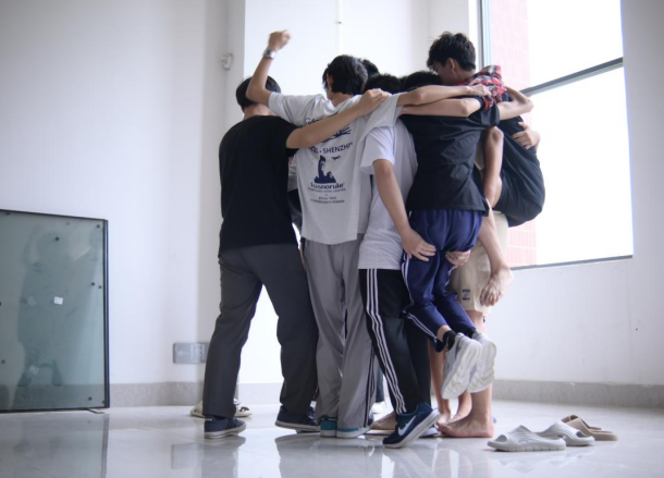 两两一组,一名同学在铺满障碍的道路上闭眼前进,根据队友的指挥,迈出步伐走向终点!通过这个游戏,参与者可以在实践中学会信任他人,也体会到了作为引领者的责任感。